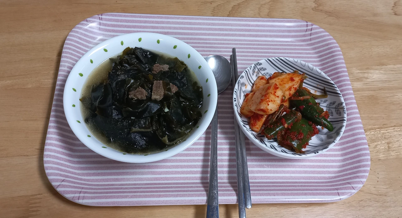 점심에는 실곤약과 열무김치를 이용해 비빔국수를 만들고 콩국물을 마셨다. 사과도 반쪽 먹었다. 저녁에는 내일이 남편 생일이라 미역국을 끓였다. 미역을 그릇 가득 담아 총각김치, 고추김치와 함께 먹었다. 아이 간식으로 만든 고구마 맛탕을 몇 개 먹었다.