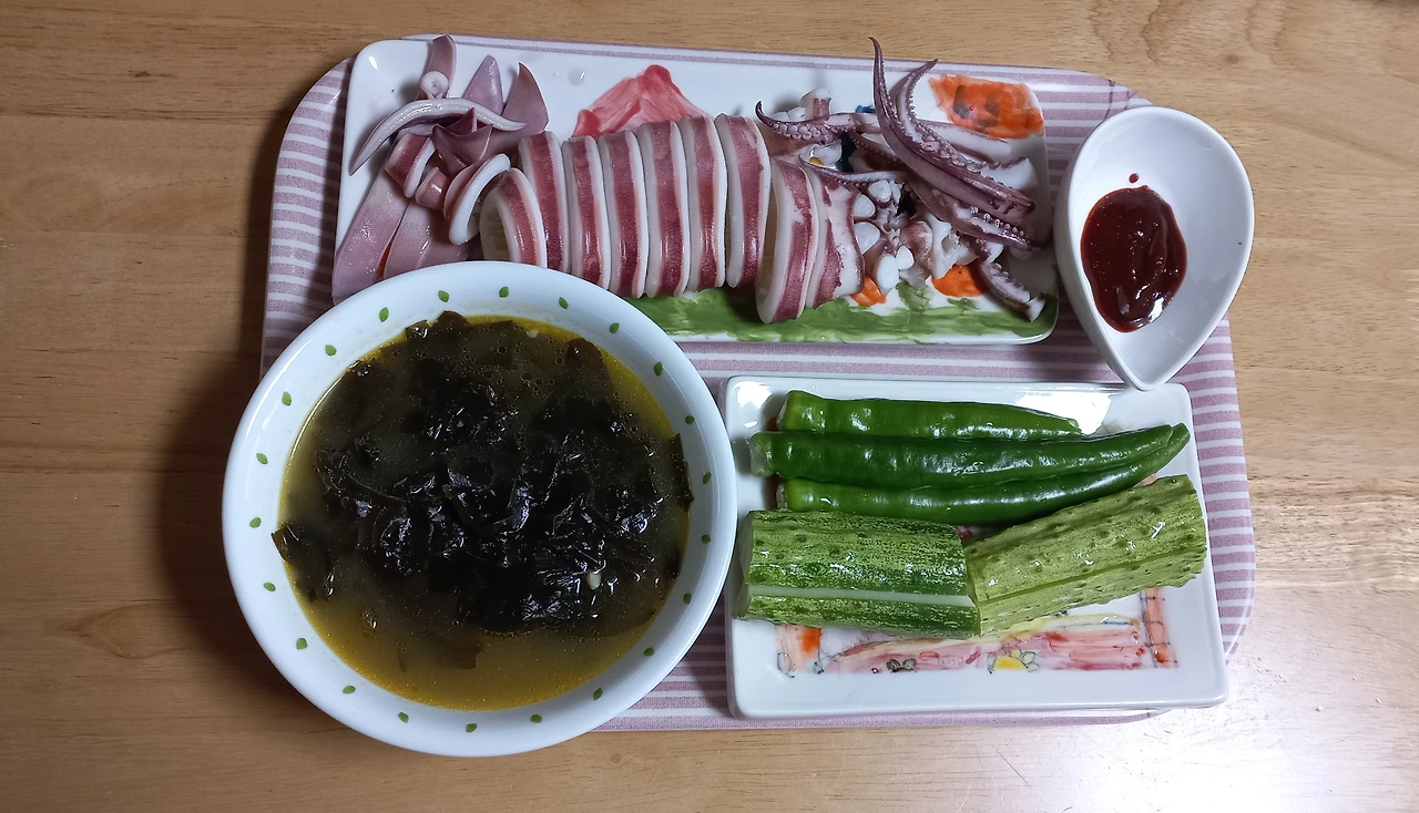 저녁에는 데친 오징어와 채소를 초장에 찍어먹었다. 남편 생일에 먹고 남은 미역국도 함께 먹었다. 살구를 두 개 먹었다.
