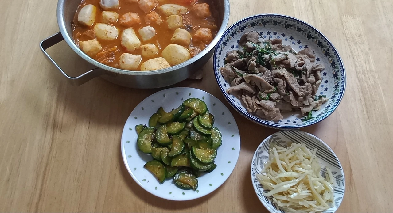 점심에 감자볶음, 호박무침, 돼지고기구이, 어묵을 먹었다. 밥이 빠져서 그런지 입맛이 없어 많이 먹지 못했다. 저녁은 어제 많이 먹은 게 찔려서 간단하게 콩국물 한 잔과 복숭아로 때웠다.