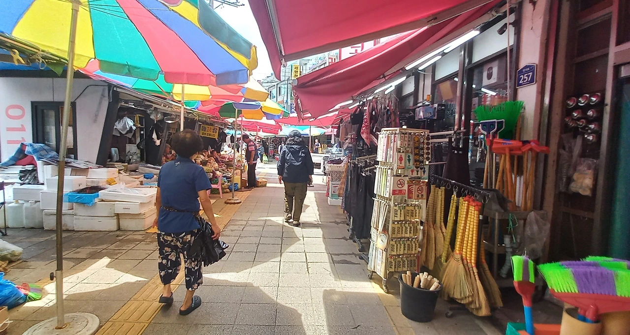 내 발길이 향한 곳은 집에서 십여분 정도 걸어서 갈 수 있는 전통시장이다. 시장을 어슬렁 거리며 구경을 했다. 시장 안에는 생선가게, 반찬가게, 과일가게, 만물상, 꽃집, 떡집 등 다양한 물건을 파는 가게들이 있다. 사람들로 북적이는 주말에 가면 어슬렁 거리기가 쉽지 않지만 평일 낮에는 사람이 그다지 많지 않아 여유롭게 둘러볼 수 있다.