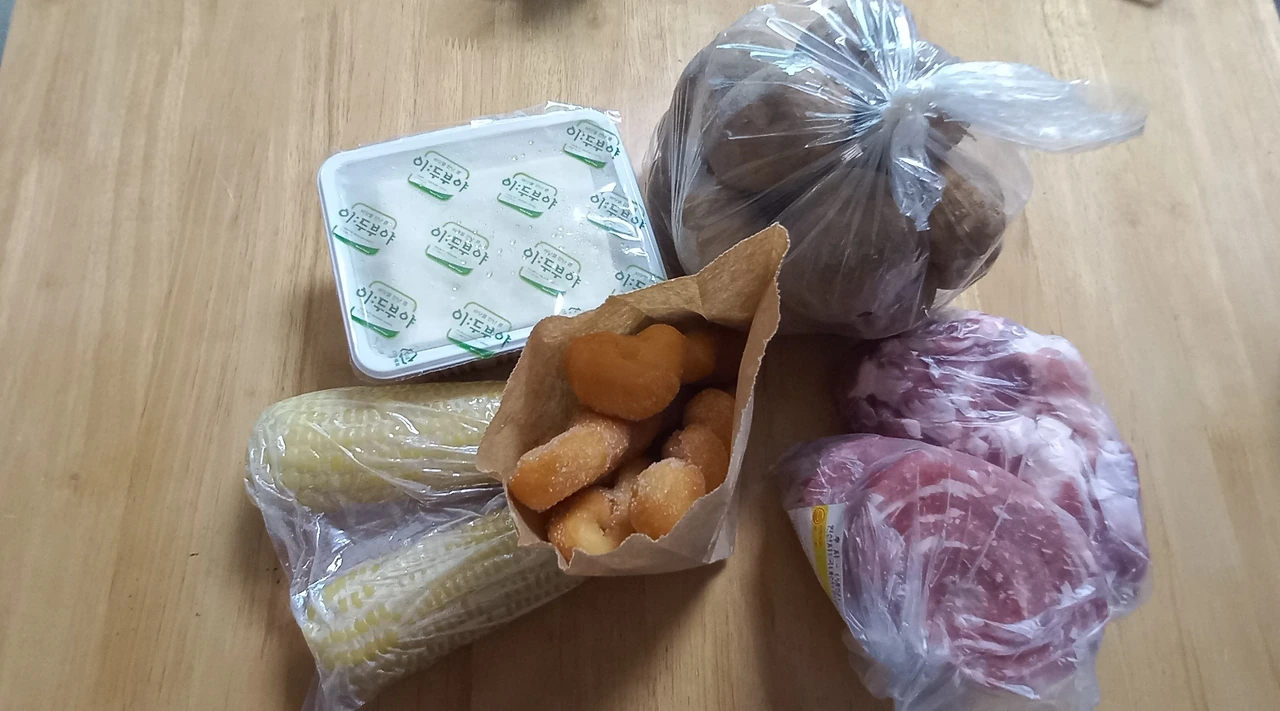 정육점에 들러 돼지고기를 사고, 야채가게에서 감자도 샀다. 남편한테 받은 만원은 오백 원을 남기고 다 썼기 때문에 고기는 카드로 사고 감자값 이천 원은 계좌이체를 했다.