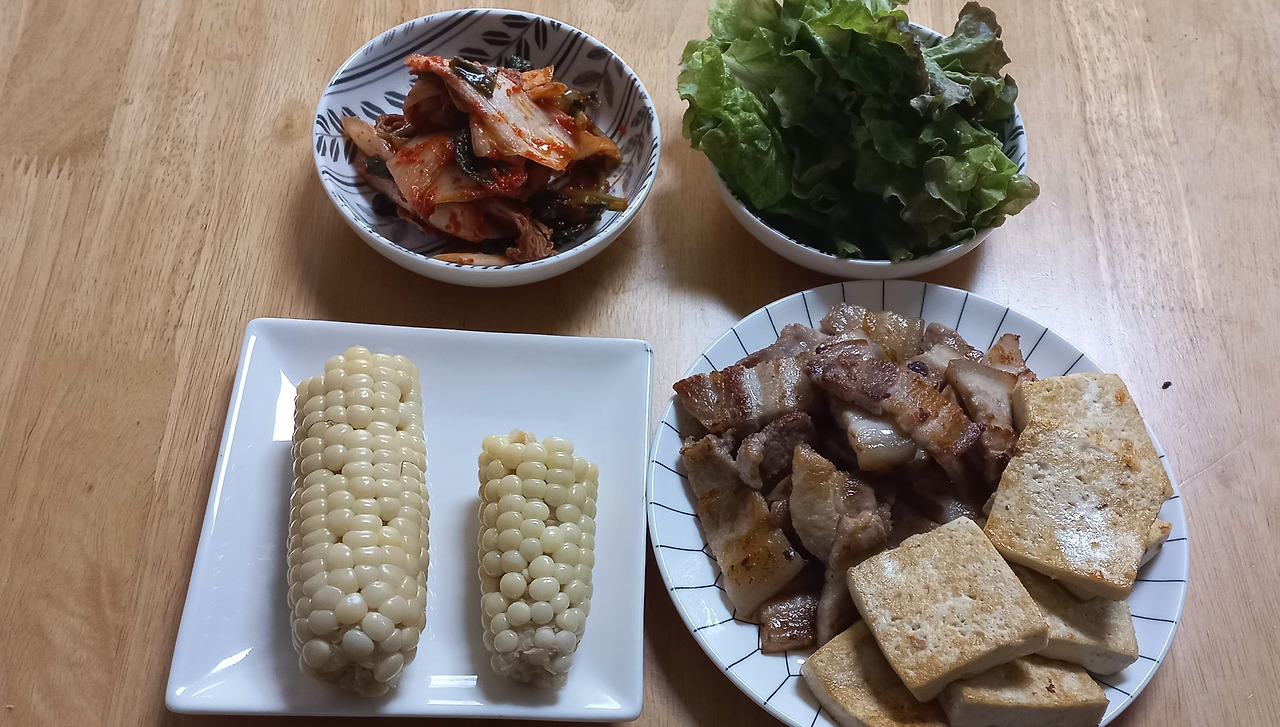 저녁 : 삼겹살, 두부, 김치, 상추, 옥수수. 점심을 가볍게 먹어서 저녁을 든든하게 먹으려고 했는데 딸이 외출에서 돌아와 삼겹살을 거의 다 뺏어먹었다.