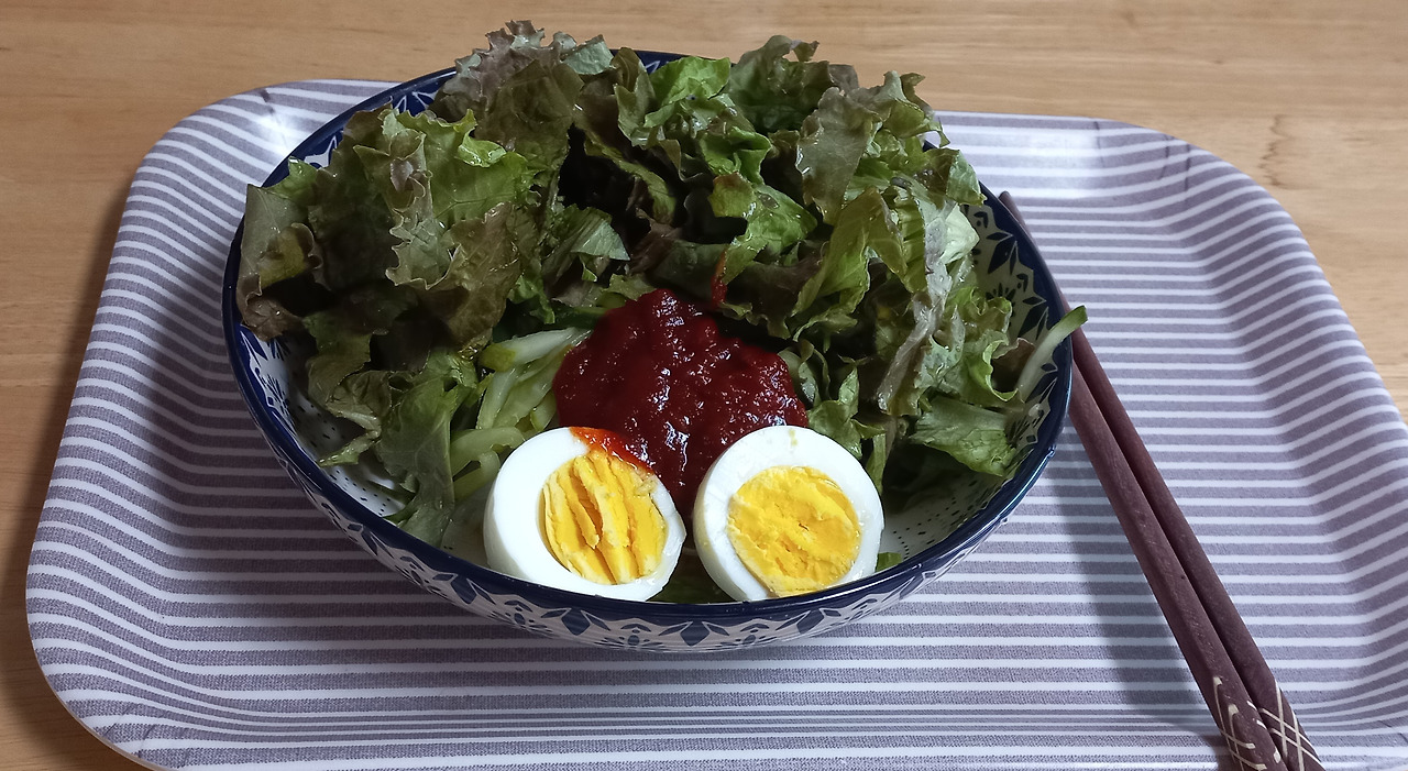 점심 : 실곤약, 절인 오인, 상추, 계란에 들기름을 뿌리고 비빔냉면장으로 비벼 먹었다. 딱 비빔냉면 맛이다. 실곤약을 이렇게 익히지 않고 먹을 때는 뜨거운 물에 살짝 데쳤다 헹구는 게 좋다. 보존제에 담겨 유통되기 때문에 나는 특유의 냄새가 사라진다.