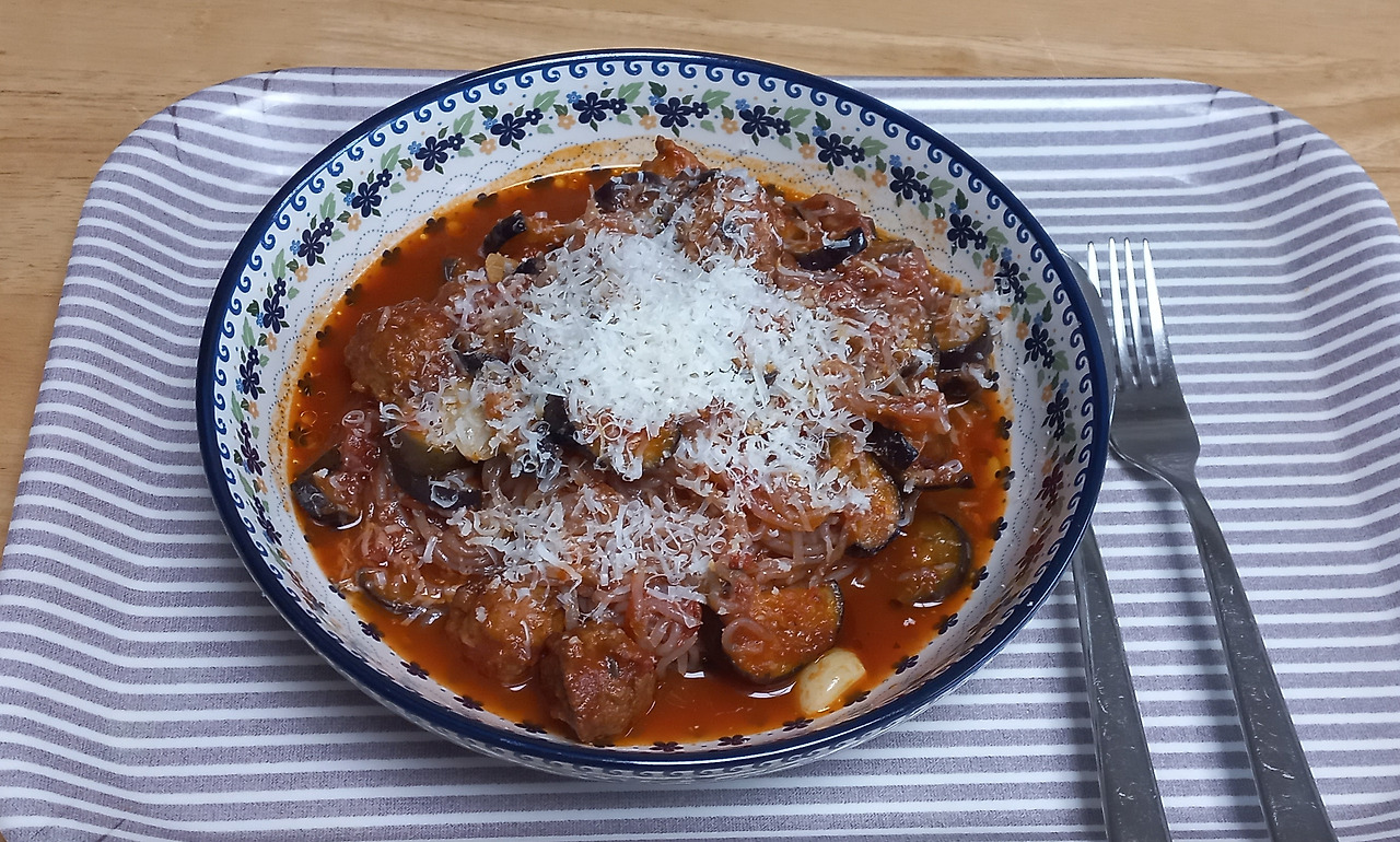 점심 : 미트볼(3분 미트볼)과 토마토소스, 가지, 마늘 그리고 실곤약을 넣은 파스타. 치즈를 갈아 올렸다.