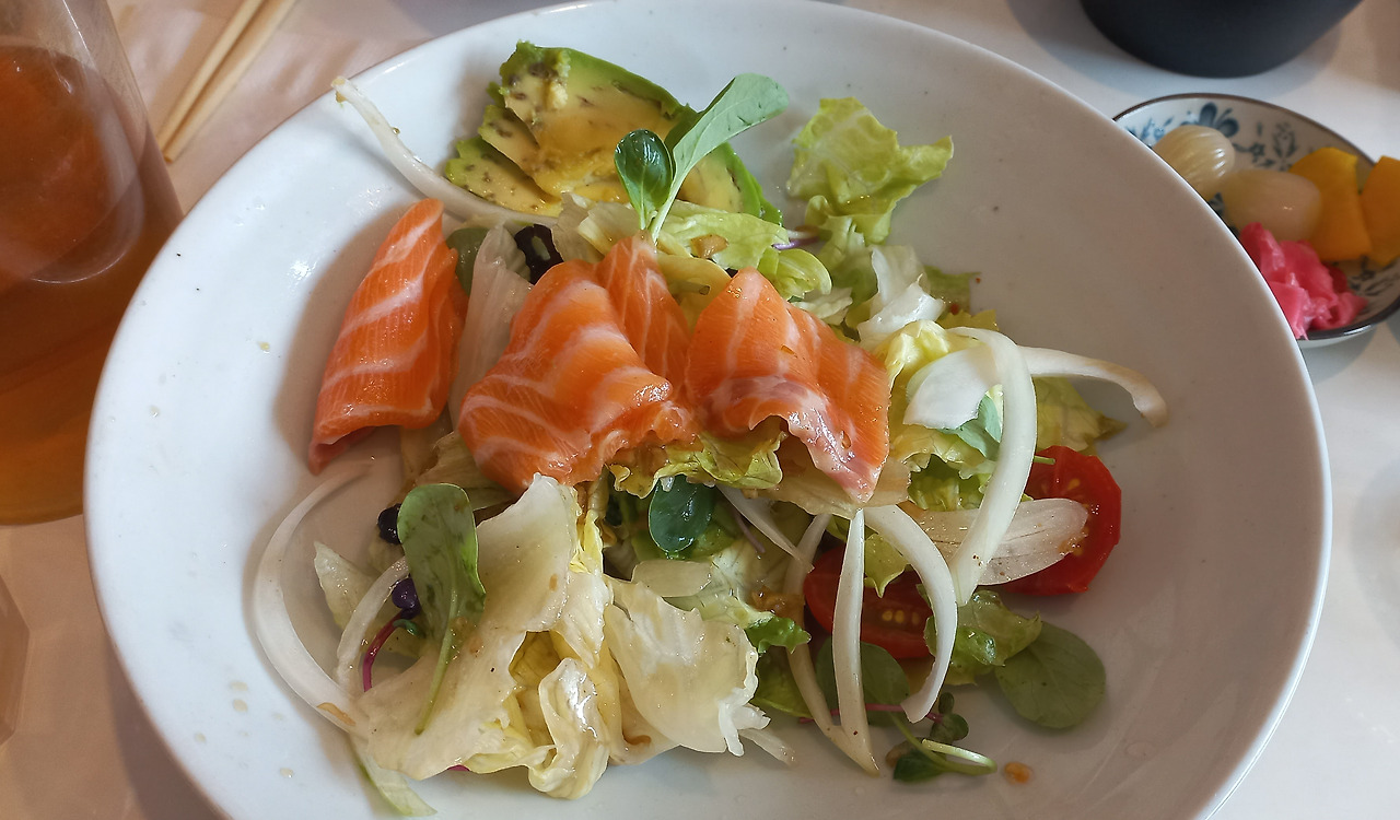 점심 : 친구를 만나기 위해 친구가 다니는 회사 앞으로 갔다. 덮밥과 초밥을 파는 곳이었는데 나는 샐러드를 시켰다. 왜 밥을 안 먹느냐는 친구의 말에 아침밥을 너무 많이 먹어서 밥 생각이 없다고 둘러댔다. 나 보다 체격이 훨씬 큰 친구 앞에서 다이어트한다는 말을 차마 할 수 없었다.