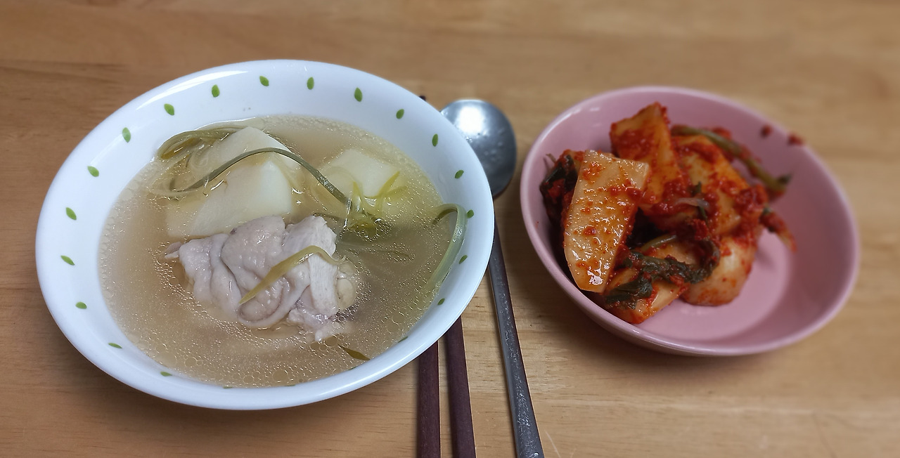 저녁 : 닭백숙, 감자, 총각김치, 오징어김치전 약간