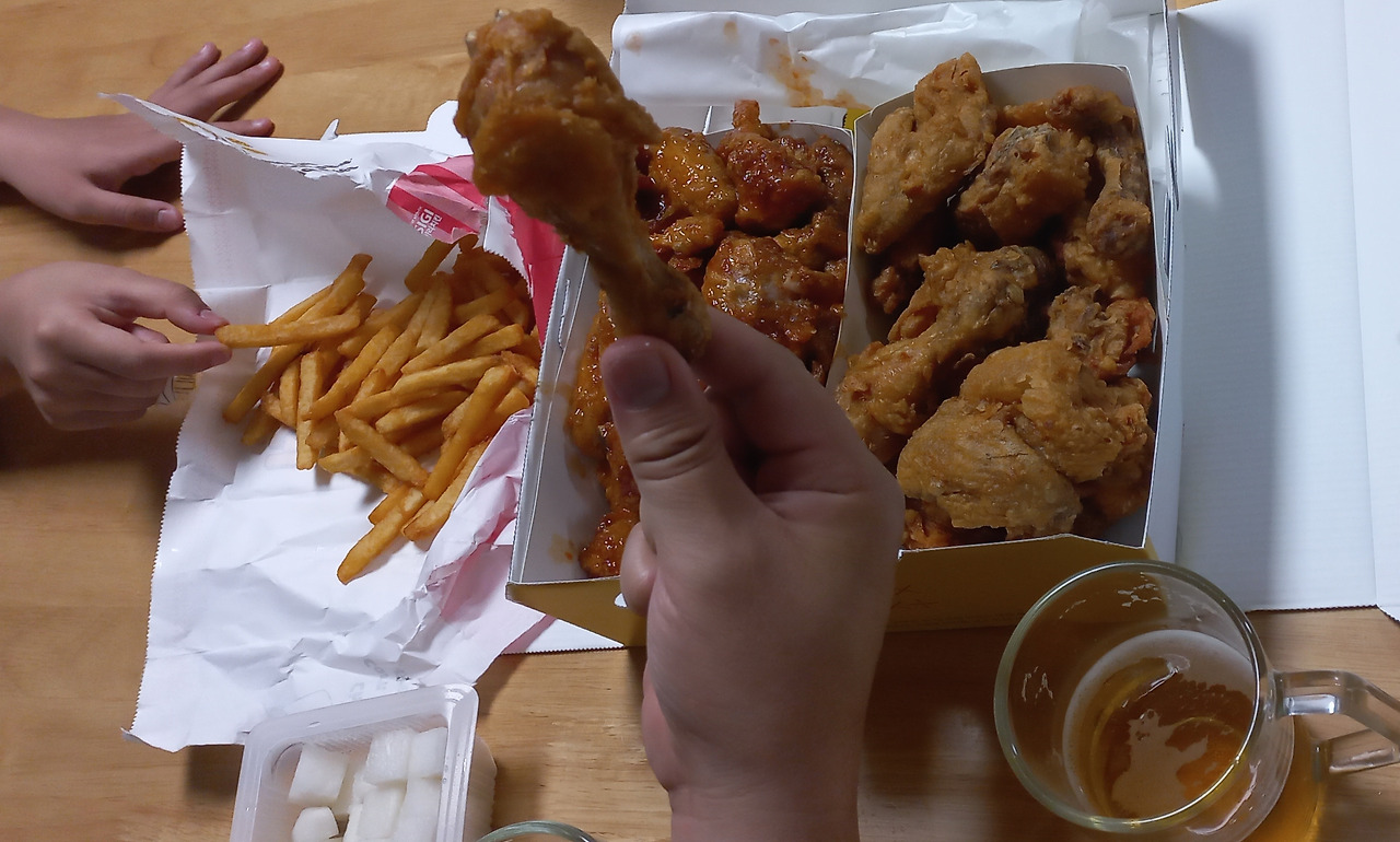 야식 : "치맥 콜?" 밤 아홉 시쯤 남편의 유혹을 뿌리치지 못한 건, 오늘 하루 종일 먹은 양이 적었고 날씨가 너무너무 더웠기 때문인 것 같다. 치킨과함께 500ml 캔맥주를 세 캔정도 마셨다. 맥주가 쫙쫙 들어갔다.