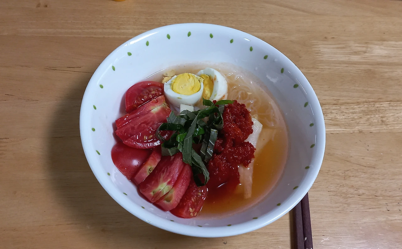 점심 : 토마토, 계란, 명태회무침, 무 초절임, 냉면육수로 만든 실곤약냉면