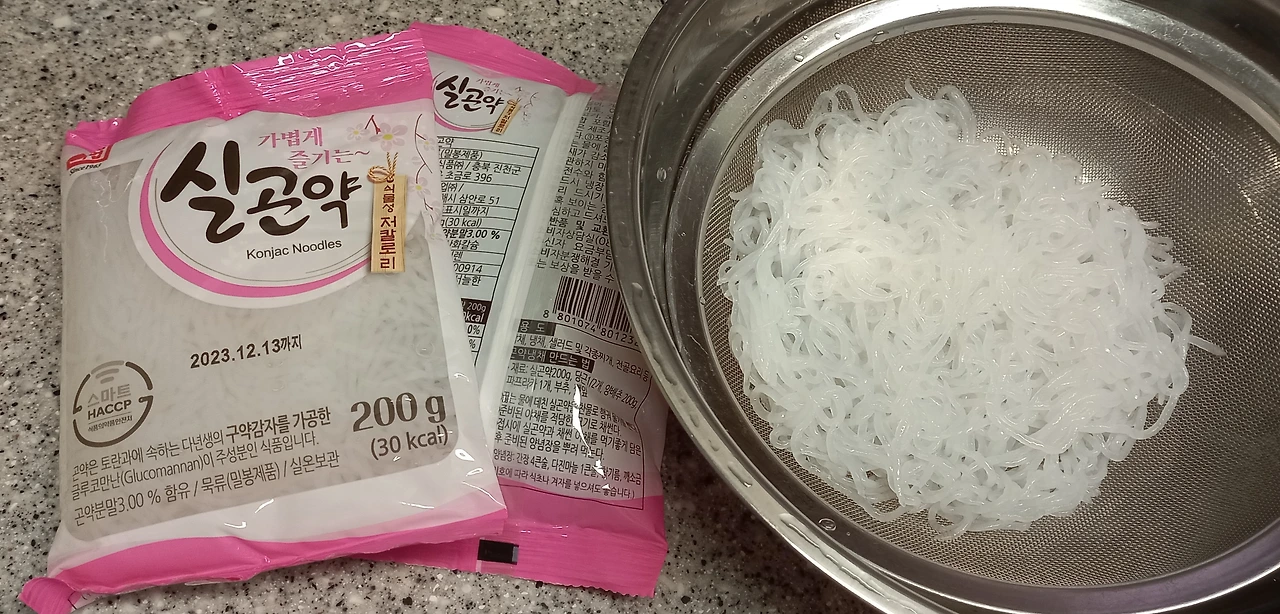 한 달간 밥빵면떡 안 먹기 도전을 시작한 지 4주가 지났다. 지난 4주간 내가 가장 많이 먹은 건 실곤약이다. 구약감자라는 식물로 만든 곤약은 주성분이 수분과 식이섬유로 이루어져 있어 칼로리는 낮으면서 포만감을 준다. 다이어트는 물론이고 혈관, 당뇨 개선에도 도움을 주는 식품으로 알려져 있다. 곤약은 쌀이나 면, 묵 같은 형태로 판매되고 있는데 나는 면 형태로 길게 만들어진 실곤약을 좋아한다. 내가 먹고 있는 실곤약 200g 한 봉지의 칼로리는 30kcal다.