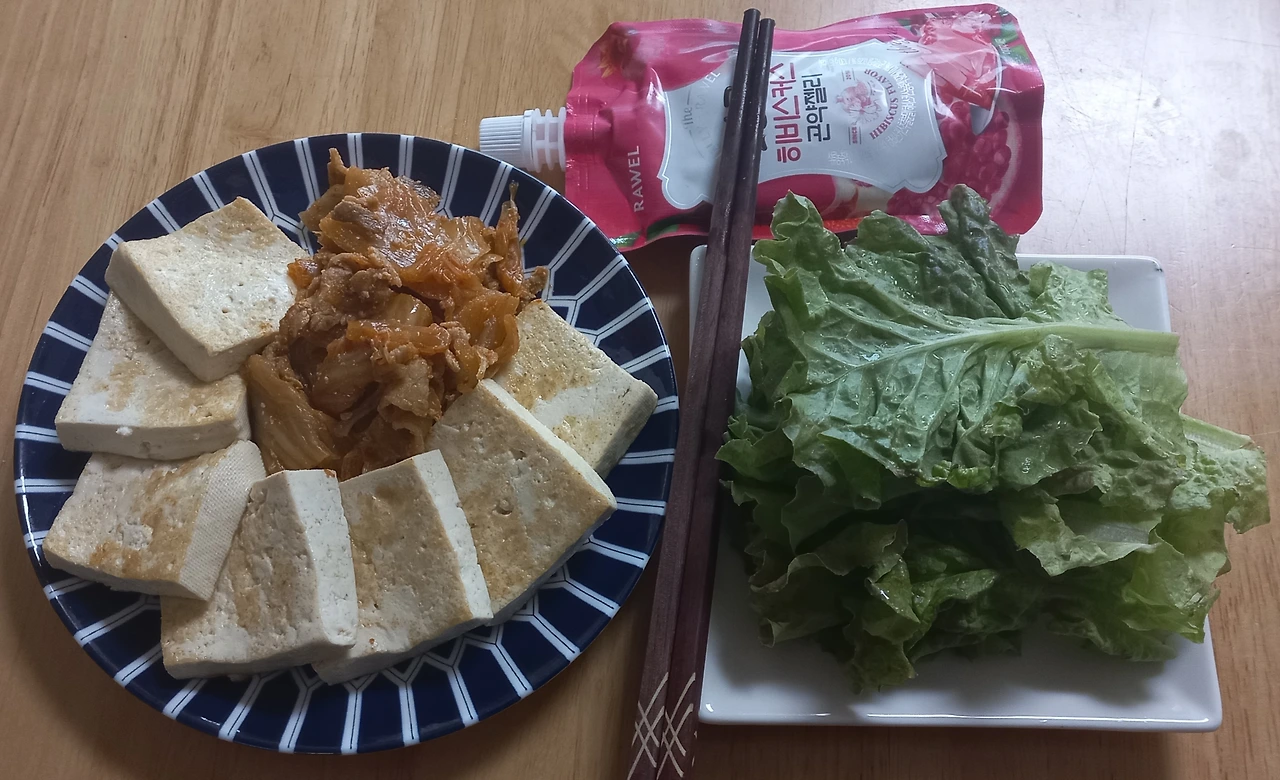 점심 : 두부를들기름에 구웠다. 돼지고기 뒷다리살과 김치를 볶았다. 상추와 함께 먹었다. 간식이 당길 때 먹으려고 곤약젤리를 주문했는데 칼로리는 6kcal로 매우 낮지만, 너무 달고 첨가물이 많이 들어서 별로다. 아이들이 잘 먹는다.