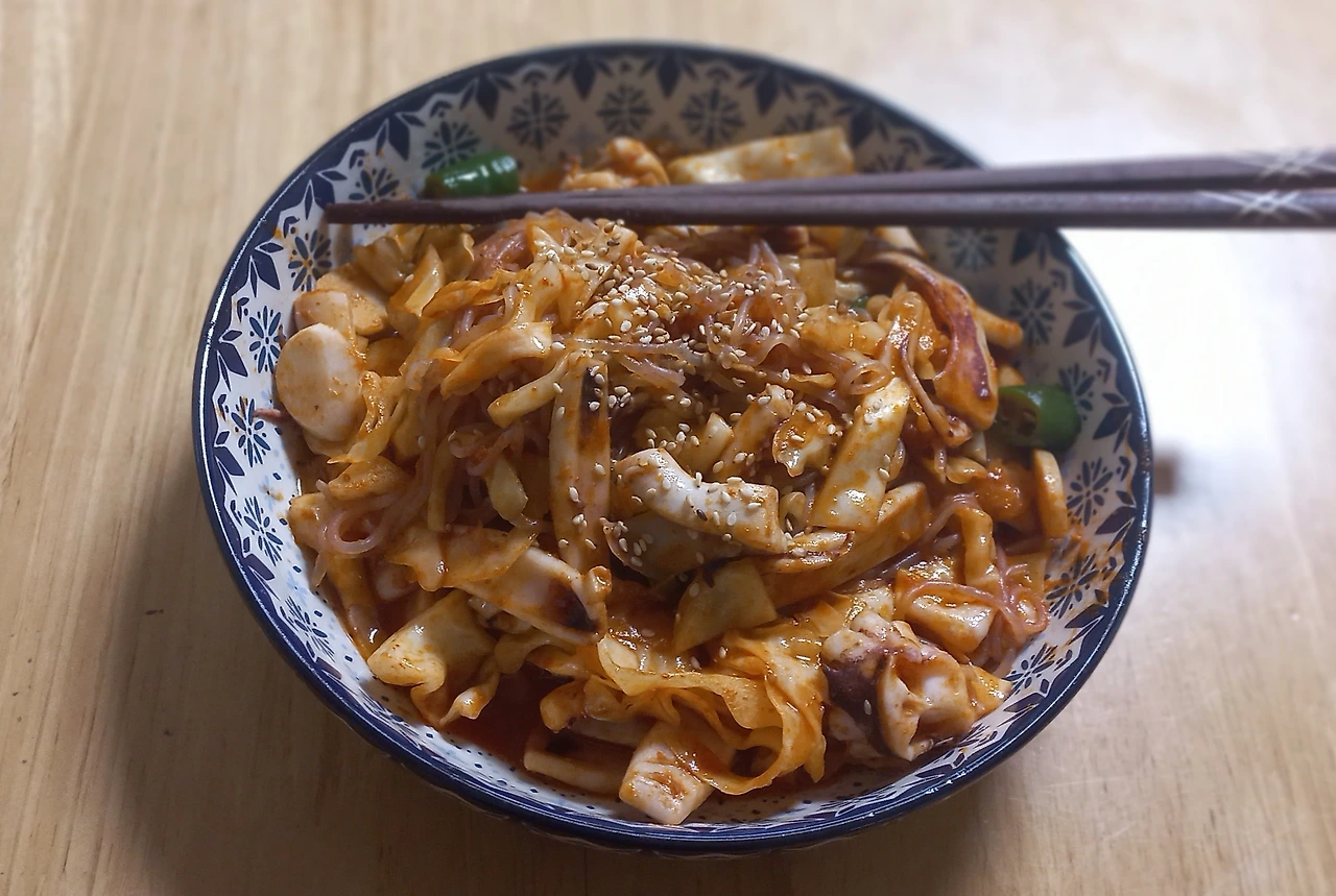 저녁 : 오징어볶음을 만들었다. 매콤한 고추장을 이용해 볶은 오징어와 양배추 그리고 실곤약을 입에 넣는 순간, 와~오징어볶음 소면 먹는 느낌! 많은 듯했는데 싹싹 비웠다.