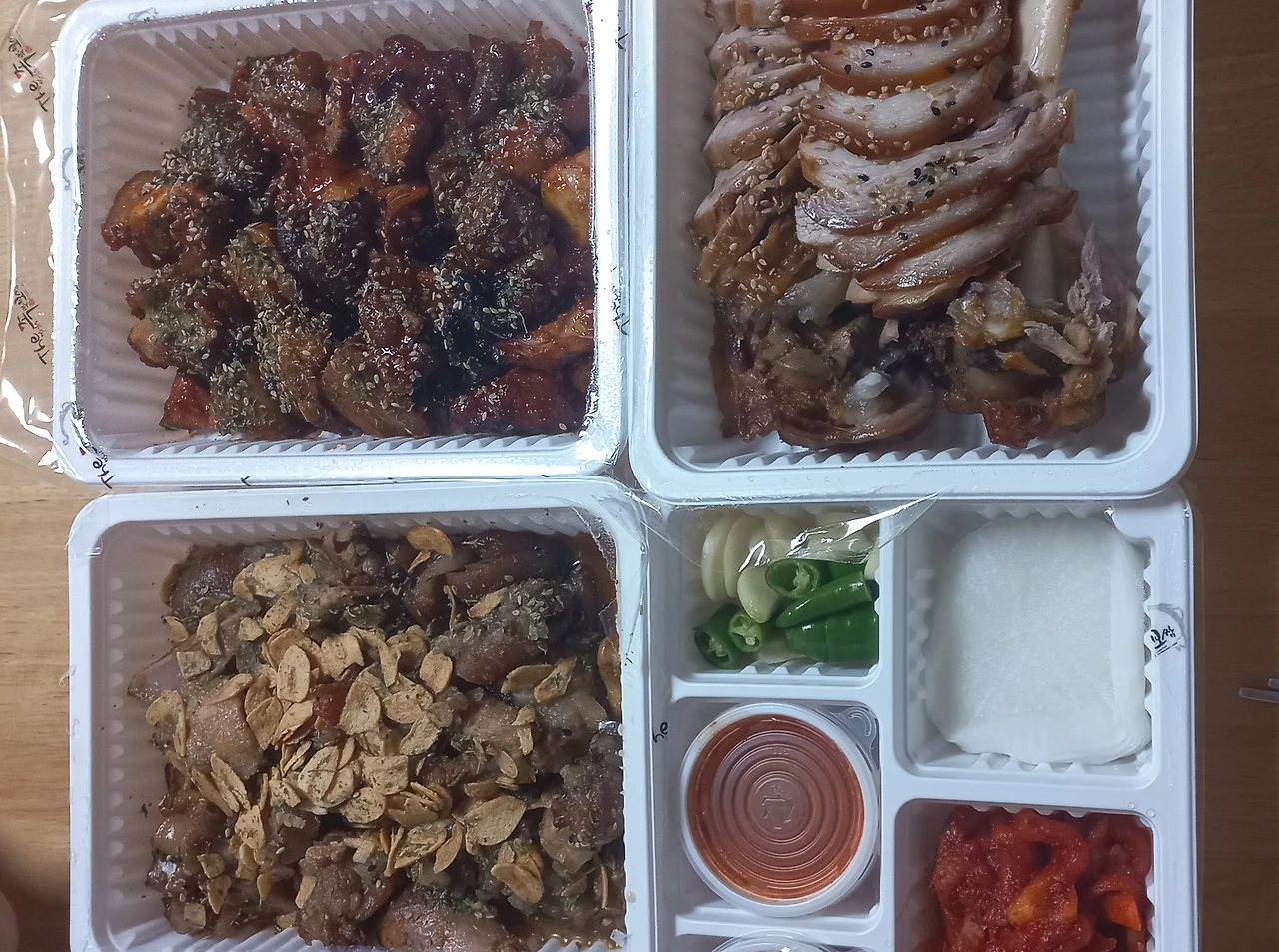 저녁 : 둘째 딸이 마늘족발을 먹고 싶다고 했다. 나는 불족발이 당겼다. 세 가지 맛 족발 세트를 시켰다. 족발을 상추와 쌈무에 싸서 맛있게 먹었다. 불족발이 너무 매워서 입안이 얼얼해 율무차를 한 잔 마셨다.