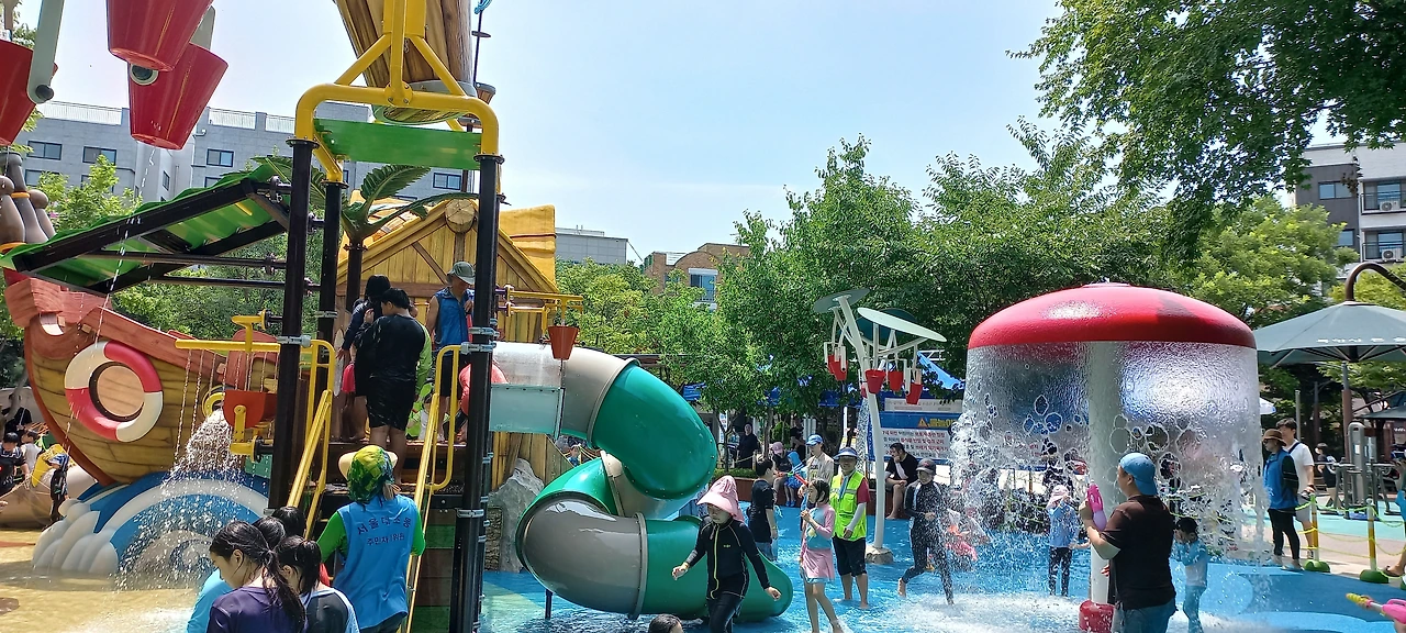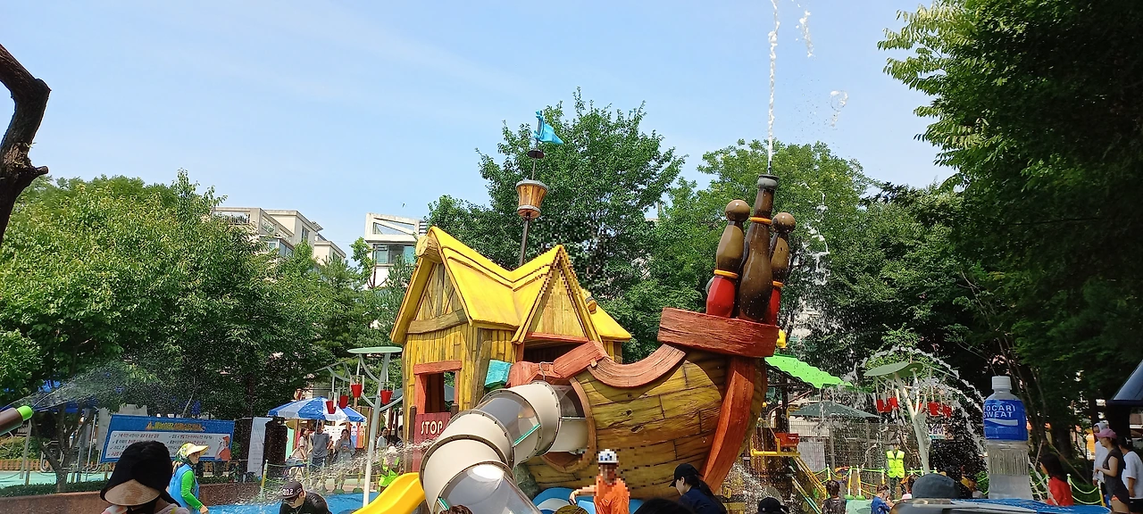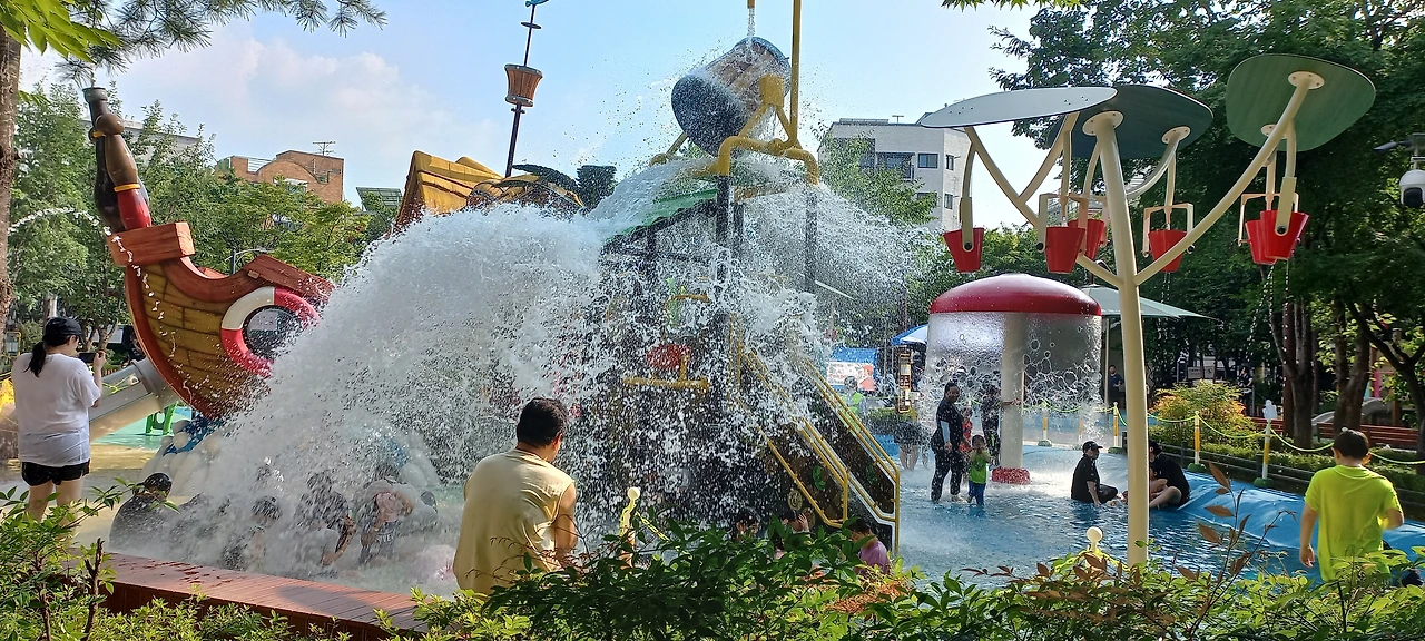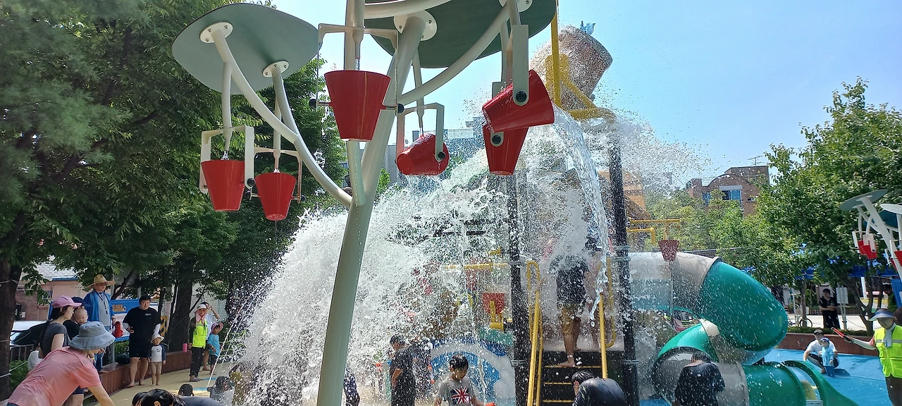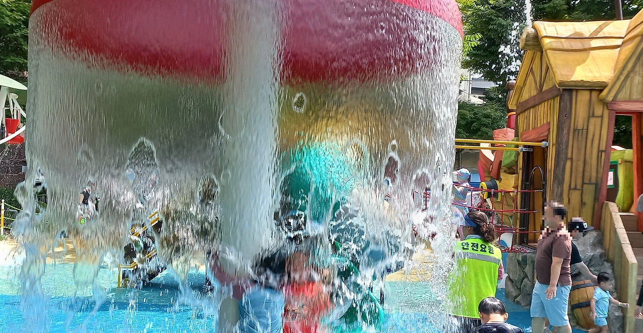 초등학교 방학이 시작되고 며칠 뒤인 7월 24일에 공사가 마무리되고, 25일에 물놀이터를 개방했다. 지나가다 보니 그야말로 물난리가 났다. 좋아서 뛰어다니는 아이들, 위험하니 뛰지 말라고 확성기에 대고 제지하는 안전요원, 미끄럼틀 위 바구니와 여기저기서 쉴 새 없이 쏟아지는 물폭포... 와, 워터파크가 따로 없구나!
