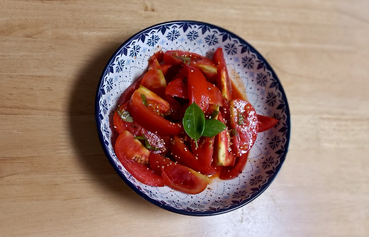 토마토를 썰어 고춧가루와 참치액, 설탕 약간 그리고 바질을 썰어 넣고 무쳤다. 올리브오일을 살짝 뿌렸다.