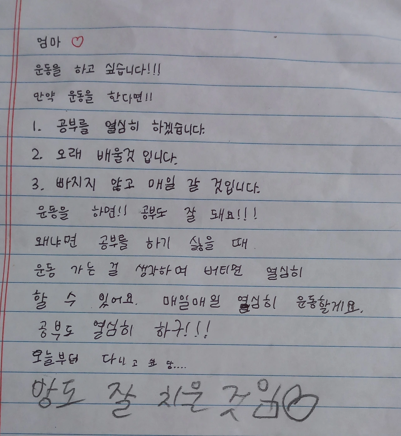 "엄마, 나 운동 다니고 싶은데. 내일부터."