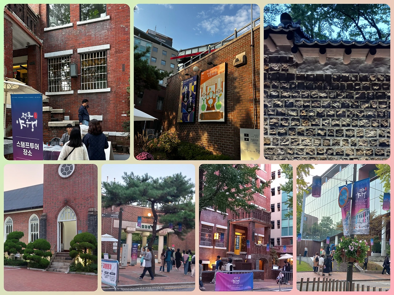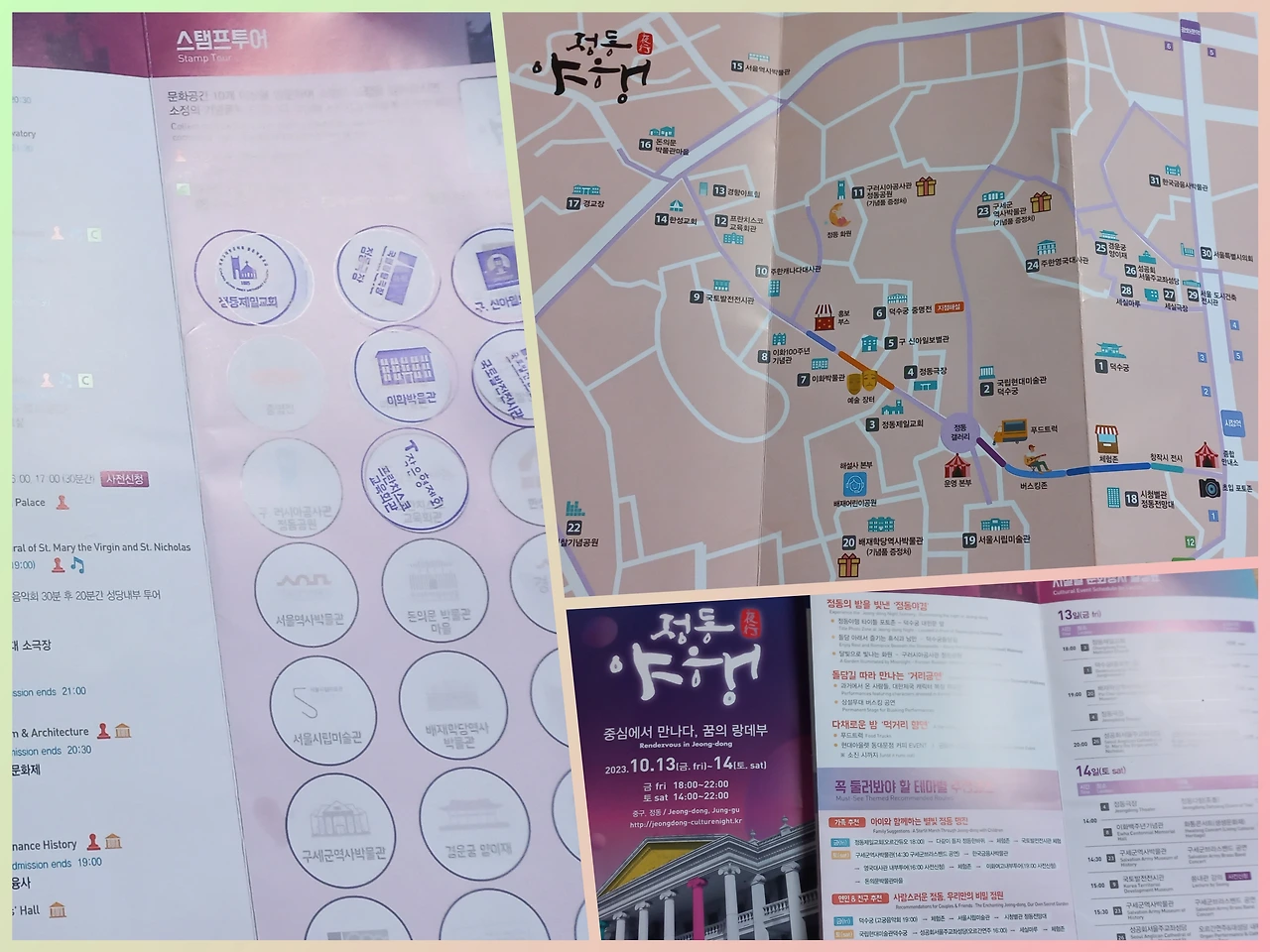 덕수궁은 시청 앞에 있다. 시청 앞 광장에서 무슨 행사를 하고 있어 시끌벅적했다. 우리는 덕수궁 쪽으로 횡단보도를 건넜다. 그곳 역시 <정동 야행>이라는 축제를 하고 있어 사람들로 붐볐다. 덕수궁 돌담길을 따라 거리공연과 체험부스, 먹거리 트럭이 늘어서 있었고 정동제일교회, 정동극장, 구세군역사박물관 등 정동에 위치한 문화공간을 방문하면 스탬프를 찍어주는 행사를 하고 있었다. 우리는 행사 안내지를 들고 걸으며 보이는 곳마다 들러 스탬프를 받았다.