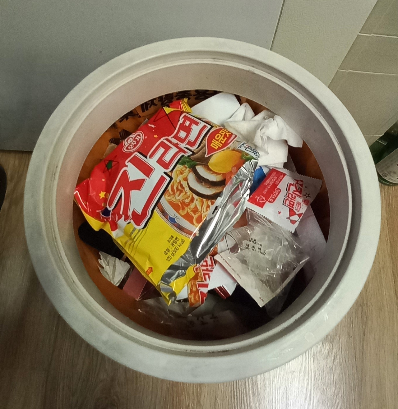 그럼 그렇지! 쓰레기통 안에는 라면 봉지 하나가 떡하니 놓여 있었다.
