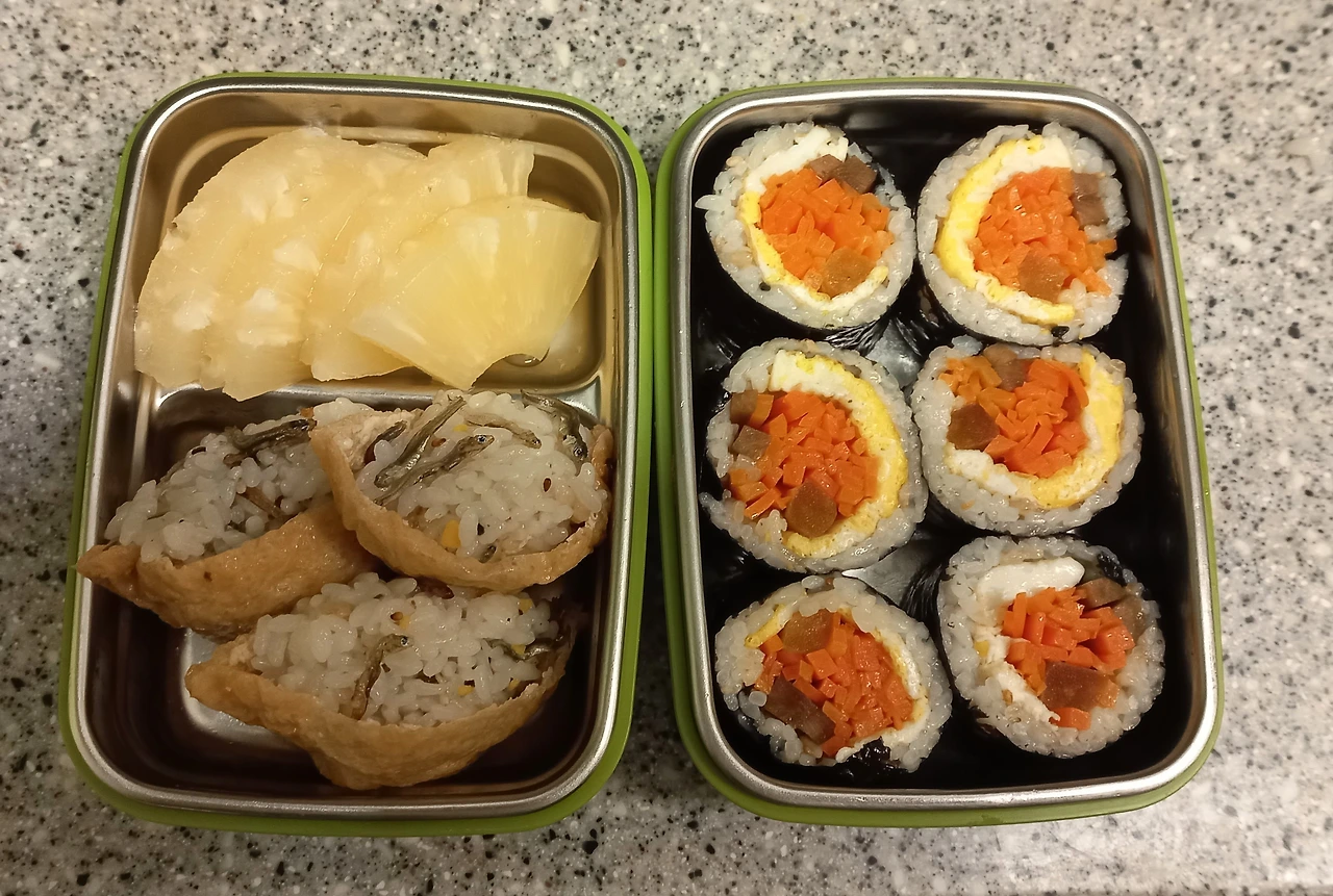 첫날은 제철 맞아 저렴하고 맛 좋은 당근을 듬뿍 넣은 김밥을 쌌다. 김밥만으로 부족할 것 같아 멸치를 넣은 유부초밥과 파인애플도 함께 쌌다.