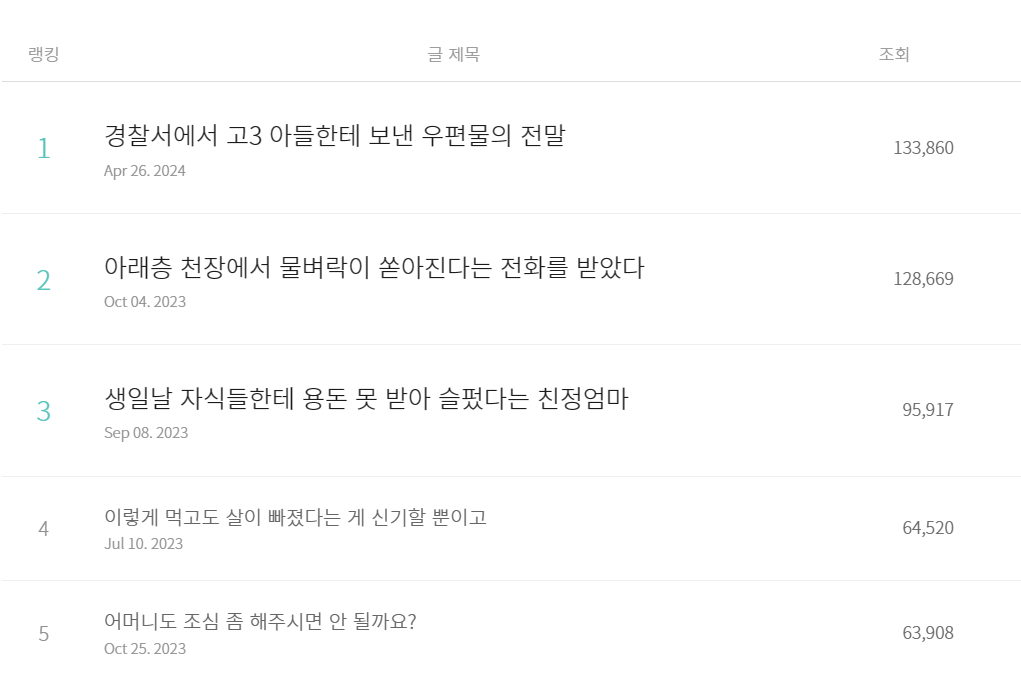 작년 10월에 썼던 '아래층 천장에서 물벼락이 쏟아진다는 전화를 받았다'가 총 조회수 12만 정도로 몇 달간 내 글랭킹 1위였다. 이번에 내 글랭킹 1위가 '경찰서에서 고3 아들한테 보낸 우편물의 전말'로 바뀌었다. 이 글은 다음 메인에 걸려 조회수가 13만이 넘었고, 오마이뉴스에도 게재돼 3만이 넘는 조회수가 나왔다.