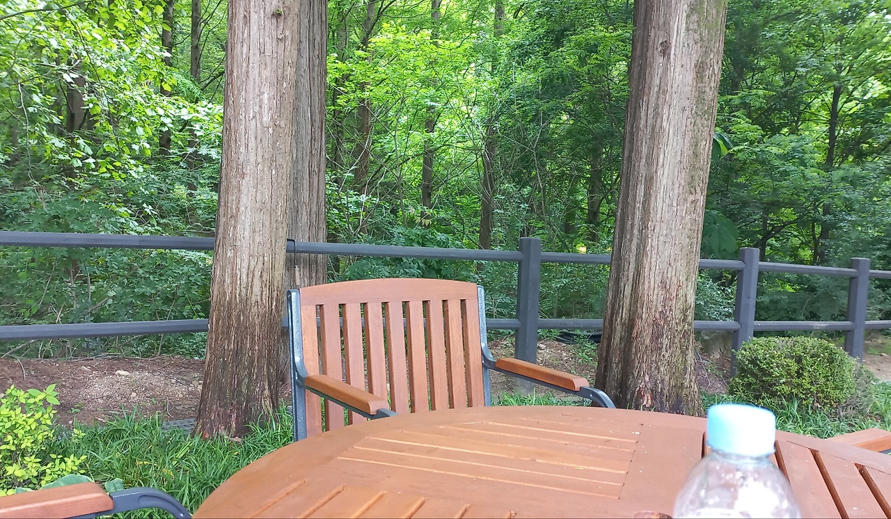 동물원 출구 쪽으로 내려와 기린과 홍학을 보고 나서 맞은편을 보니, 서울에서 일부러 찾아가는 숲 속 카페 같은 곳이 보였다. 아무나 앉아도 되는 테이블이었다. 잎이 푸르른 나무들과 그 사이로 비치는 햇살을 바라보고, 계곡 물소리, 새소리를 들으며 몇십 분을 멍하니 앉아 있었다.