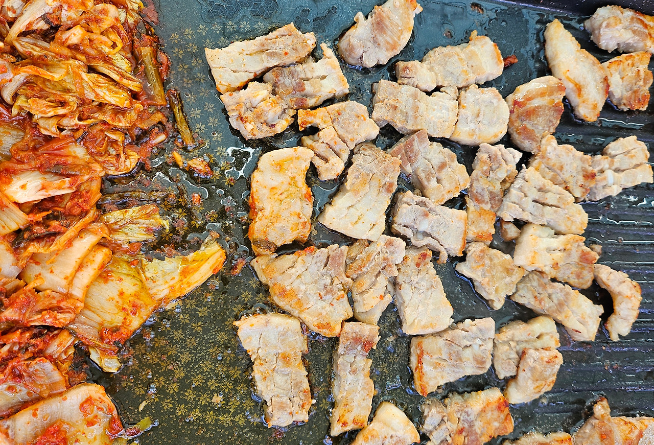 전기 그릴에 구운 삼겹살과 김치, 여기에 볶음밥도 해 먹었다