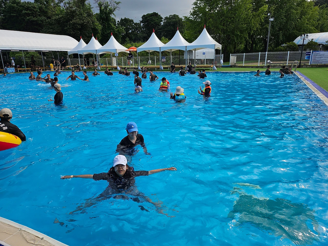 군인들은 11시쯤 모두 돌아갔고, 이제 수영장은 많이 한적해졌다. 나도 좀 즐겨볼까. 튜브를 집어 들고 물에 발을 담가본다. 차다. 들어가지 말까. 망설이면 못 들어간다. 에라, 모르겠다. 튜브를 끼고 물속으로 첨벙. 와, 헉, 차가... 시원해. 차가움은 금방 후련함으로, 시원함으로 바뀐다.