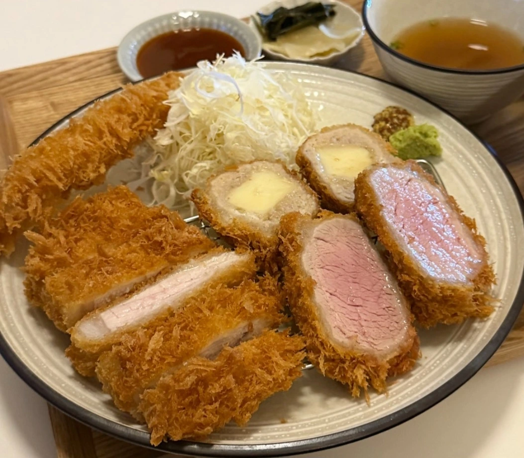 라멘과 돈카츠카레도 맛있어 보였지만, 남편의 모둠카츠는 입장하는 순간부터 겉바속촉의 황홀한 느낌을 물씬 풍기는 압도적인 자태가 내 시선을 사로잡았다. 특히 일반 돈카츠 집에서 보기 힘든 큰 사이즈의 새우튀김이 너무나 먹음직스러워 보였다.