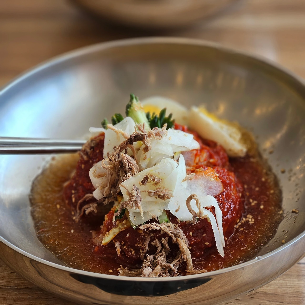 두번째로 부술 것은 밀면(만빙고 제면소). 첫날에 이어 또 밀면 먹기로 결정. 밀면이 너무 맛있기 때문이다. 이번엔 물비빔밀면을 시켰다. 첫날 먹었던 밀면과는 또 다른 매력. 역시나 맛있었다. 둘이 먹기에 좋은 점은 사이드 메뉴를 시킬 수 있다는 것. 만두도 한 판 시켜 야무지게 먹었다. 이쁘게 올라가 있던 고기고명이 하필 사진 찍을 때 도로록 떨어져서 살짝 속상.