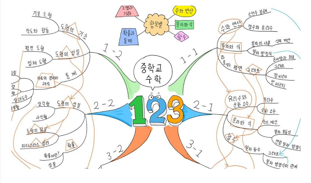 중학교 1,2,3학년 1,2학기 총 6학기 동안 배워야 할 수학 개념들에는 무엇이 있고,