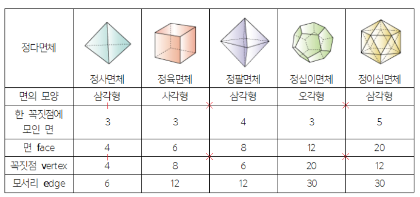 정다면체란, 모든 면의 모양이 같고, 한 꼭짓점에 모인 면의 개수가 같은 입체도형으로,