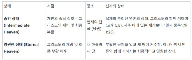 중간 상태는 완전한 상태가 아니며, 인간은 영과 육이 결합된 총체적 존재로 창조되었기에 최종적인 구원은 반드시 육체의 부활을 포함해야 합니다(이하의 글에서 일컫는 천국은 새 하늘과 새 땅을 말합니다).