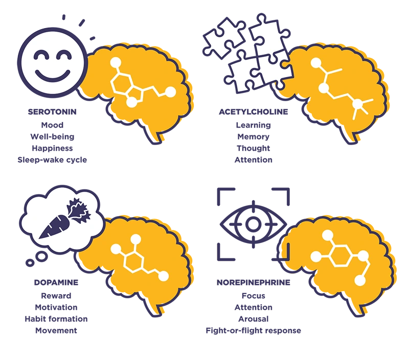 우울함과 낮은 집중력의 원인은 무엇일까요? 주된 원인 중 하나는 신경전달물질(neurotransmitter)의 분비 이상입니다. 신경전달물질은 신경 말단에서 분비되어 다른 신경에 정보를 전달하는 미세 물질로, 세로토닌, 도파민, 아세틸콜린, 노르에피네프린 등이 잘 알려져 있습니다.