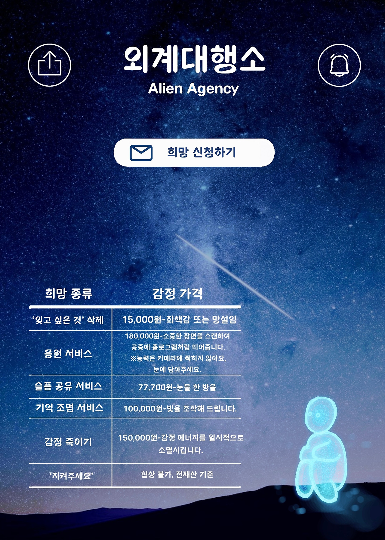 청하는 혹시라도 나쁜 쪽으로 빠지지 않길 마음속으로 기도하며 머릿속에서 떠오르는 답변을 계속해서 던져봤다. 다 같이 머리를 감싸고 고전하고 있을 때 자연스레 누군가 아이스크림을 꺼내 들었다. 달콤한 무의식 속 향연이 지나가고 누군가 재채기를 했다. 순간 건물 전체의 조명이 반짝였다. 동시에 둘은 윤슬을 바라봤다. 가슴속 어딘가에 아주 작은 스위치가 눌린 듯했다. 아직 아무 일도 일어나지 않았지만 뭔가가 시작된 듯한 긴장과 설렘을 가득 실은 기류가 머릿속을 스치고 지나가 한 명이 자리를 박차고 일어났다. 한 명은 받아 적을 준비를 하고 그렇게 한바탕 소동이 벌어졌다. '외계대행소- 골치 아픈 문제를 외계 루트로 한 번에 해결해 드립니다. 사람 대신 기적을 만들어주는 대행 서비스.'