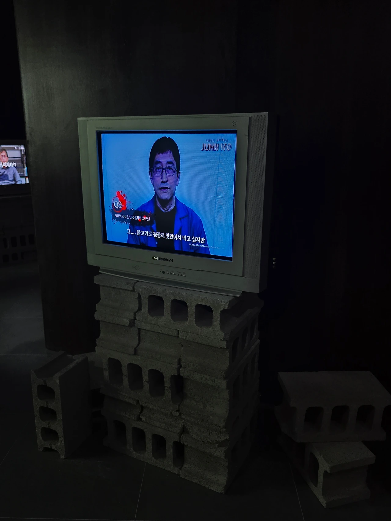 체험을 끝내고 나오면 이렇게 이토준지 컬렉션 애니메이션 원화와 이토준지 작가님의 인터뷰가 나오는 아날로그 TV를 볼 수 있습니다. 참고로 저 질문의 답은 삼계탕입니다.