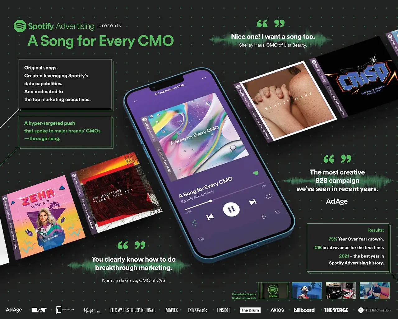 2022년 칸라이언즈에 올라온 수상작 중 스포티파이의 'A song for every CMO' 캠페인이 인상적이었다. 스포티파이는 자신들의 광고 영업을 위해 세계적인 회사의 CMO 14명에게 각각의 취향에 맞는 세상에 하나밖에 없는 음악 앨범을 만들어주었다.
