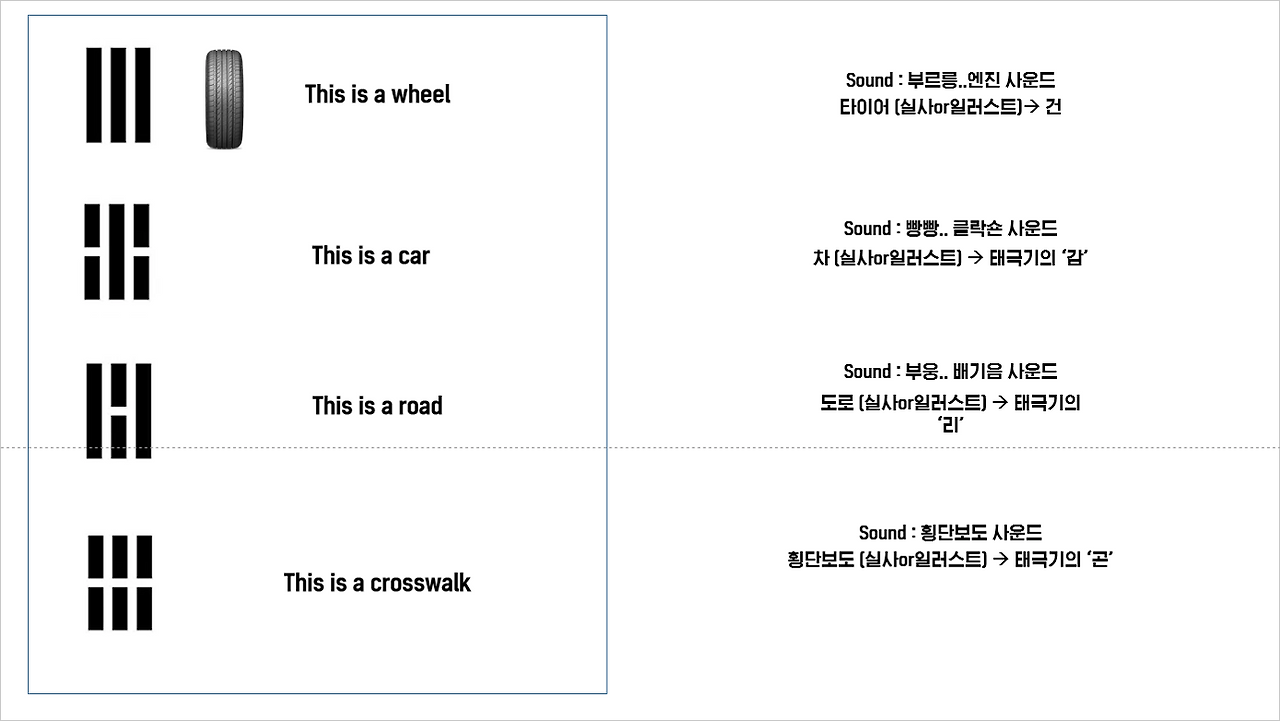 건은 타이어를 앞에서 본 모양, 곤은 횡단보도를 위에서 본 모양, 리는 중앙선이 있는 도로와 같았다.