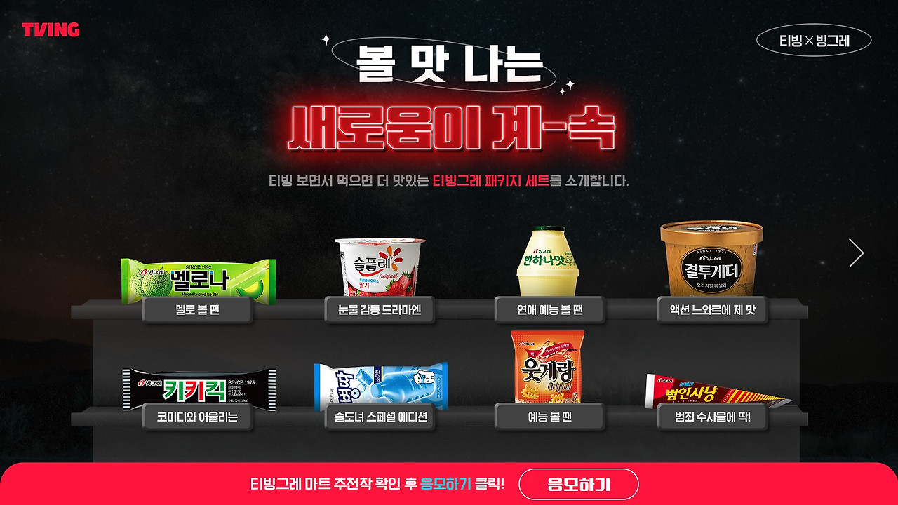 아이디어를 요약하자면 티빙의 드라마를 볼 때 먹을 수 있는 빙그레의 간식 패키지를 선물하는 이벤트다.