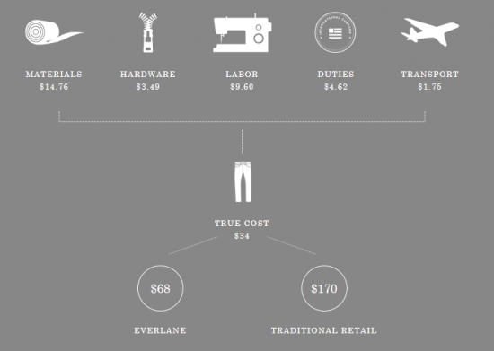 에버레인은 제품 페이지에 제품이 제작되는 데 드는 비용을 상세하게 공개했다. 기존에는 소비자가 궁금해하면서도 알 수 없었던 재료비, 인건비, 운송비, 세금, 심지어 마진 등의 정보를 공개했다. 따라서 소비자는 가격 구조를 명확하게 알 수 있었다. 가격뿐 아니라 제품이 제작되는 공장의 위치, 작업 환경, 윤리적 기준 등도 투명하게 공개했다.