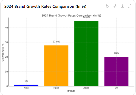 반면 북미에서는 호카(Hoka)와 온(On) 같은 경쟁사들이 고객들의 사랑을 받고 있다. 2023년부터 2024년 사이에 호카는 미국 주요 유통업체에서 시장 점유율을 4.2%에서 8.7%로 거의 두 배 가까이 증가시켰고, 온 역시 0.8%에서 6.1%로 크게 성장했다. 매출 성장률 면에서도 2023년 대비 나이키가 1% 성장에 그칠 때 호카는 27.9%, 아식스는 44.6%, 온은 20%의 성장했다.