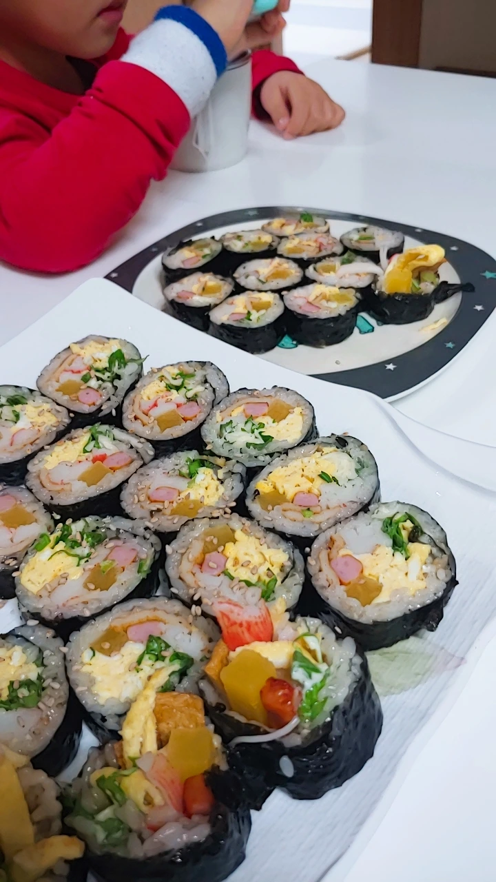성장기 어린이 셋을 건강히 키워내고 싶은 엄마의 바람, 녹황색 채소도 고루 먹이고 싶은 욕심, 몇 개 집어먹다 보면 평소 먹는 양보다 무조건 배불리 먹게 되는 마법, 세끼 정도는 반찬고민 없이 쉽게 가고자 하는 얕은수까지 김 한 장 속에 꽉꽉 말아 넣는다. '김밥아, 우리 가족의 입맛과 건강을 네가 도와주렴' 주문을 외우며 힘주어 꾹꾹 마지막 허리띠를 조여 붙인다. "또 김밥이야?"라는 외침이 들릴 때쯤엔 라면이나 떡볶이만 하나 곁들여 줘도 그 입이 쑥 들어가는, 실로 완벽한 음식이 아니던가. 반찬 걱정하다가 내 새끼들 삼시 세끼 안 굶기려 꺼낸 비장의 무기였는데, 겁 없는 김밥이 코로나 삼식이들도 살리고 나도 살렸다.역시 김밥이 해냈다.
