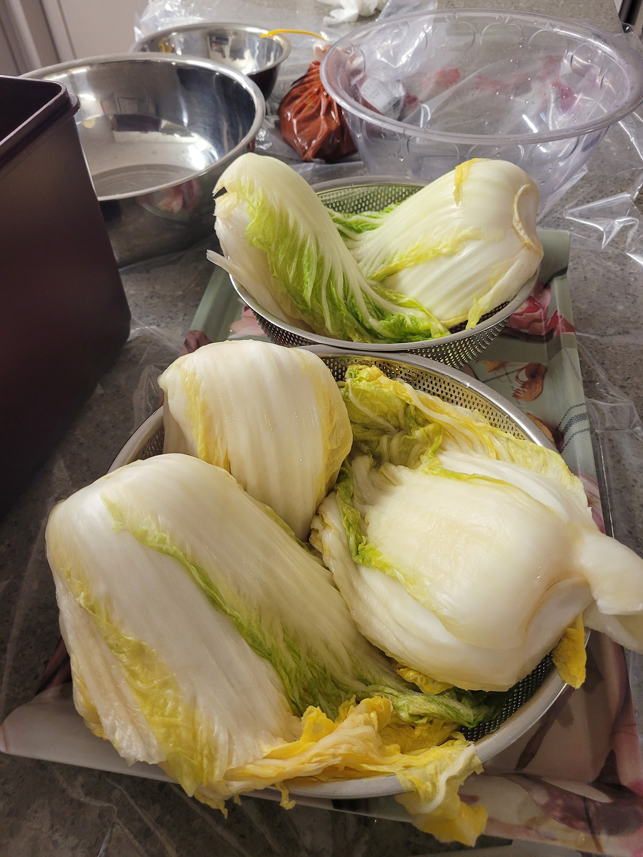 절임배추를 사 오면 그대로 양념을 치댈 수 있는 줄 알았다. 채반에 뒤집어 올려서 물기를 쫙 빼줘야 된다는 걸 몰랐다.