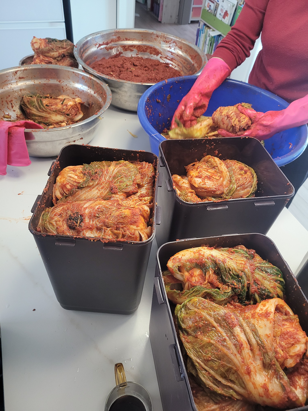 숙련된 조교의 시범을 보이시며 다시 개념원리 강의가 이루어졌다. 기본을 배웠으니 유형을 다룰 차례. 김치통이 채워질수록 스킬도 늘어가고 이내 치대는 속도도 엄마를 따라잡았다. 삼 남매의 하교와 하원 시간이 다가오기 전, 모든 배추는 김치로 변신했고 청소까지 마무리되었다. 고생하신 친정엄마의 피로를 풀어드리는 코스로 지역 내 유명한 찜질방까지 다녀옴으로써 나의 첫 김장행사는 무사히 끝났다.