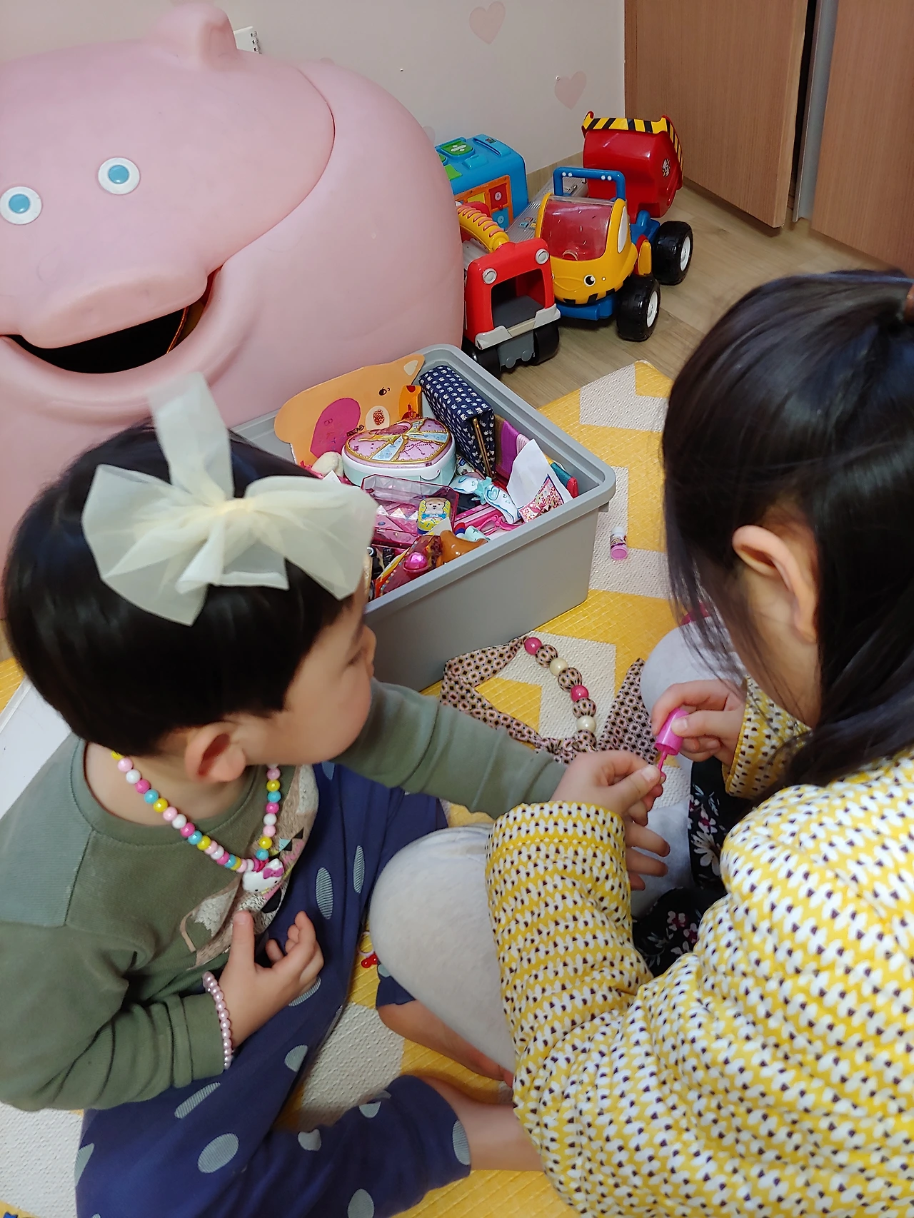 딸애가 큰 아이지만 분홍색 장난감으로 시작하지 않았다. 중장비와 공과 레일이 국민 장난감 상자에 그득했다. 아들이라고 험하게 키우지 않았다. 때로는 누나의 마루타가 되어 손톱에 매니큐어를 깔별로 칠하고 알알이 달록한 구슬 목걸이를 휘감아야 할 때도 있었다. 더군다나 누나 있는 남자애들은 어릴 적엔 핑크 내복이 국룰 아닌가?