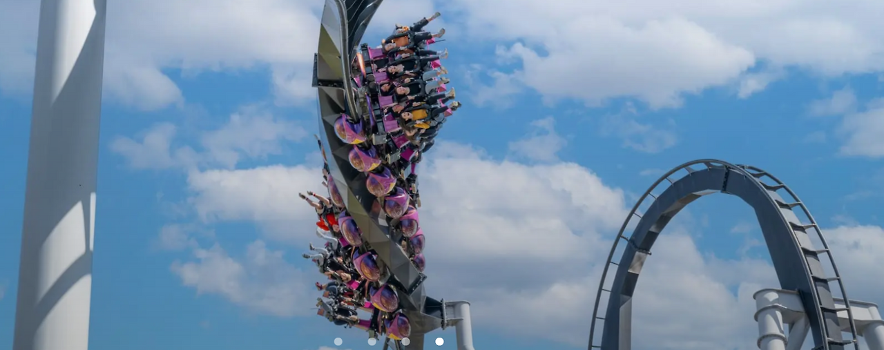 지나가다 본 노란 레일의 롤러코스터가 아주 멋졌다. 수직으로 내려오는 구간이 얼마나 긴지 고개를 한참 들어 올렸다 내려와야 했다. 그 각도도 어마어마했다. 수직, 90도임이 틀림없다. Skyrush다!