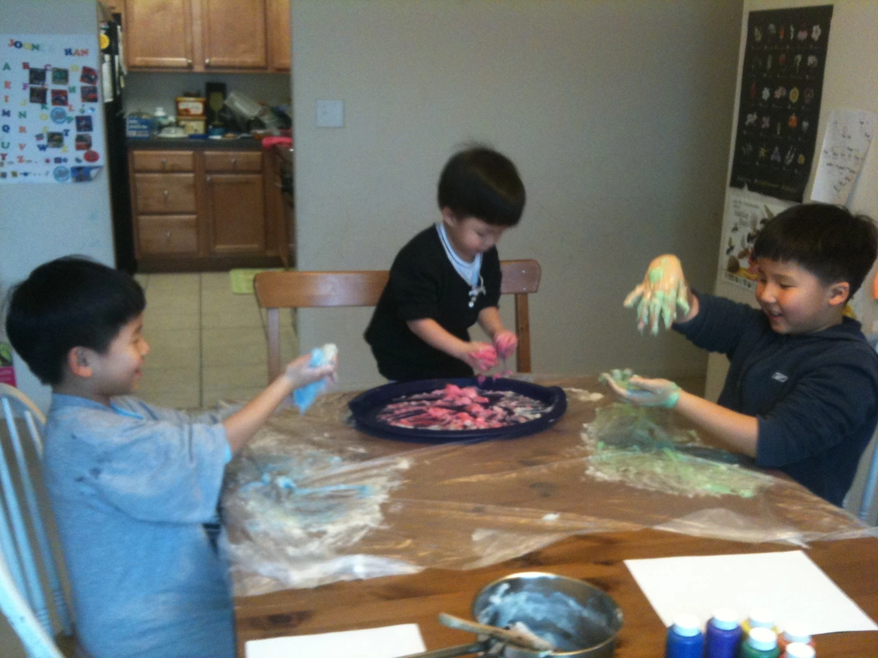 밀가루에 물만 넣고 반죽한다. 각자 원하는 색깔의 물감을 떨어뜨려 빨간색, 노란색, 파란색의 세 가지 색깔의 반죽을 만든다. 이제 그 반죽들을 섞어가며 주황색, 초록색, 보라색, 검은색들을 만들어 본다. 쿠키도 만들고 만두도 만들고 김밥도 만들고 역시 노는 것이다.