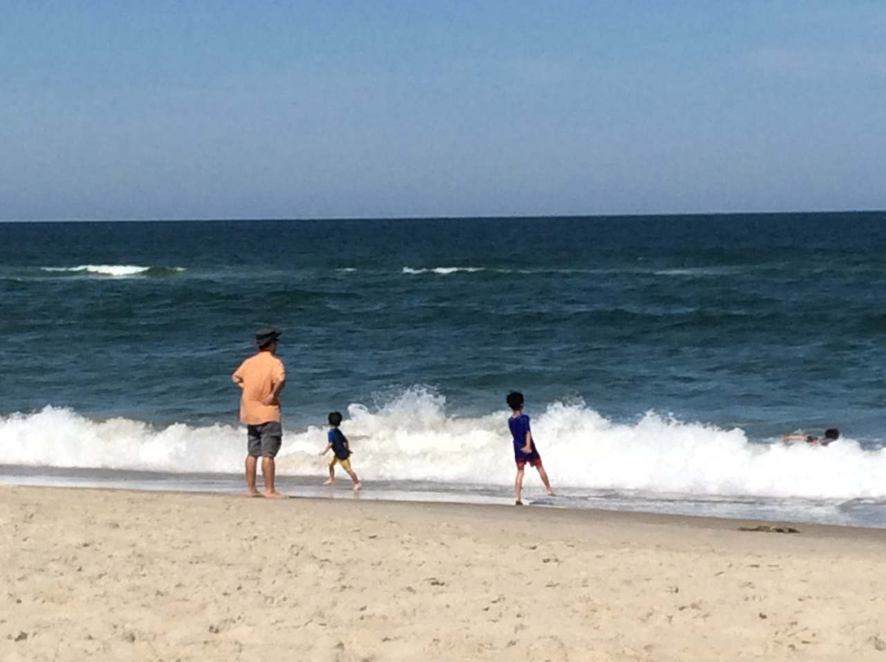 수영을 배운 아이들은 거침없이 파도를 향해 헤엄쳐 들어가거나 폴짝폴짝 파도를 넘어서며 어찌나 신나 하는지 웃음이 끊이질 않았다. 막내와 난 모래사장 앉아 그들을 지켜본다. 남편과 두 아들은 파도타기에 신이 났다. 끊임없이 치는 파도가 아이들을 행복하게 했다.