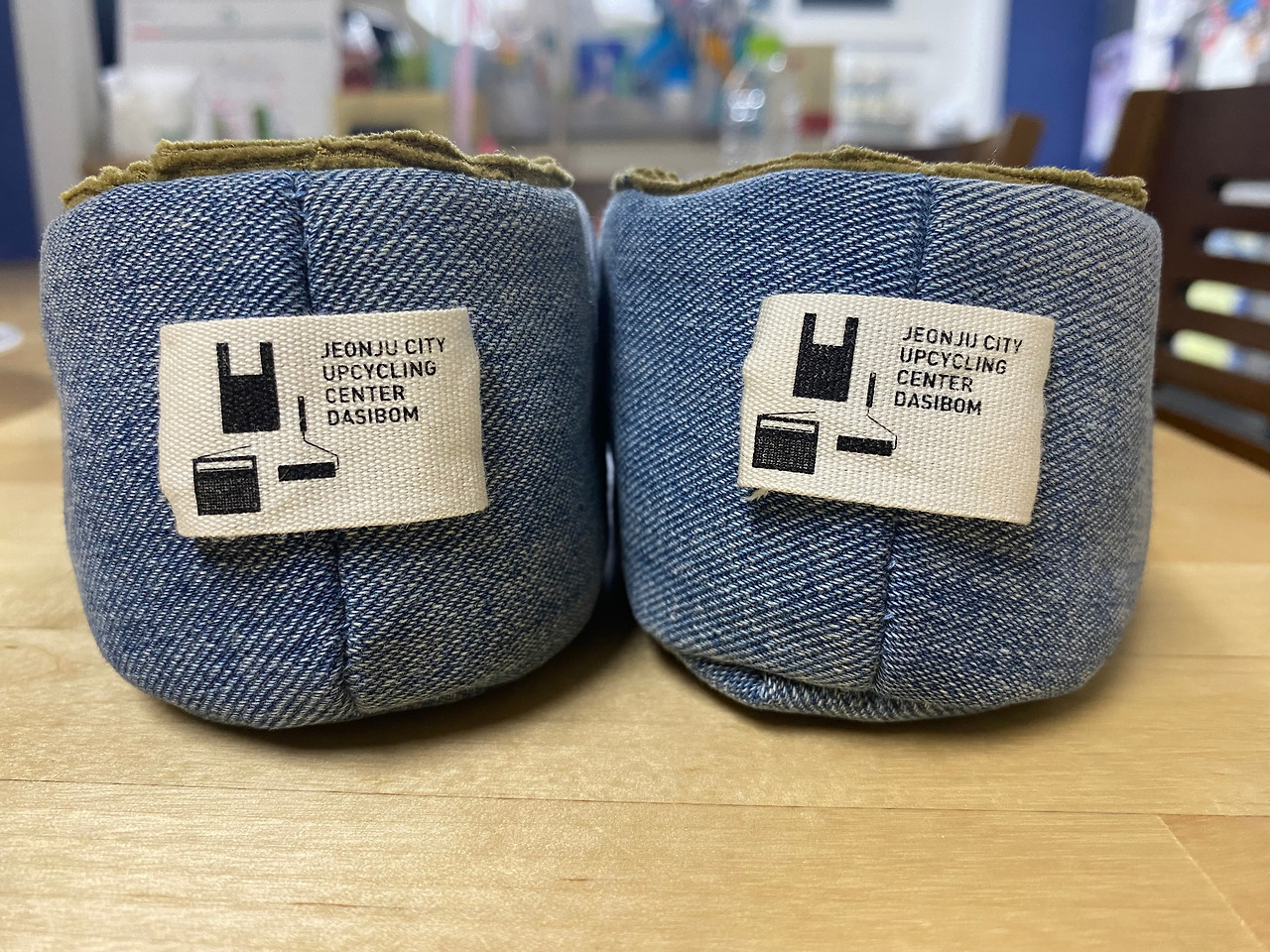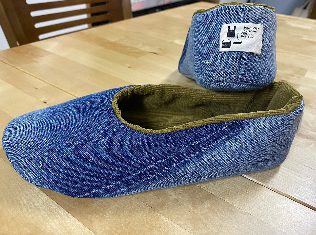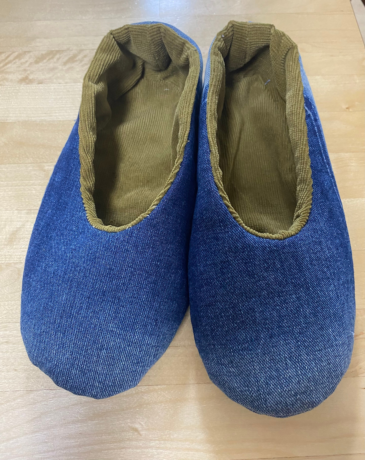 룸슈즈의 패턴은 해체한 청바지의 엉덩이 부위에 대고 그렸다. 주머니를 떼고 난 그 자리의 색이 진해서 더 예뻤다. 발바닥과 발등 두 개뿐인데도 손이 바쁘다. 여기에도 안감을 넣어야 했다. 안감이 두꺼워 바느질이 어렵다.