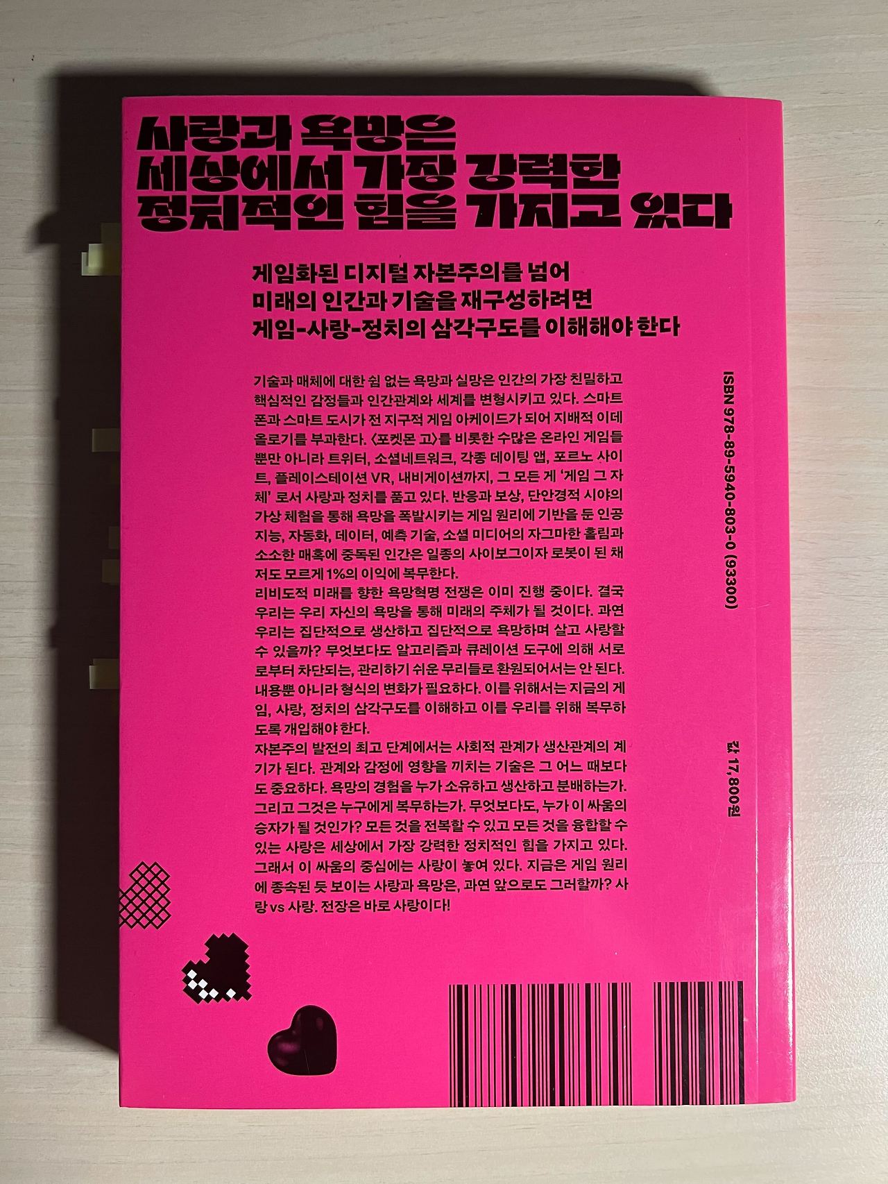 (책의 제목을 구성하는 세 개의 키워드로 대략적인 책의 내용을 요약해 봤는데, 사실 책의 내용을 더 포괄적으로 설명하기에는 다른 키워드가 더 적합하지 않나 싶다. 게임은 리비도적 쾌락을 수반하는 방식을 얘기한 것 같고, 사랑이라기보다는 더 포괄적인 개념인 욕망을 중점적으로 다루는 듯했다.)