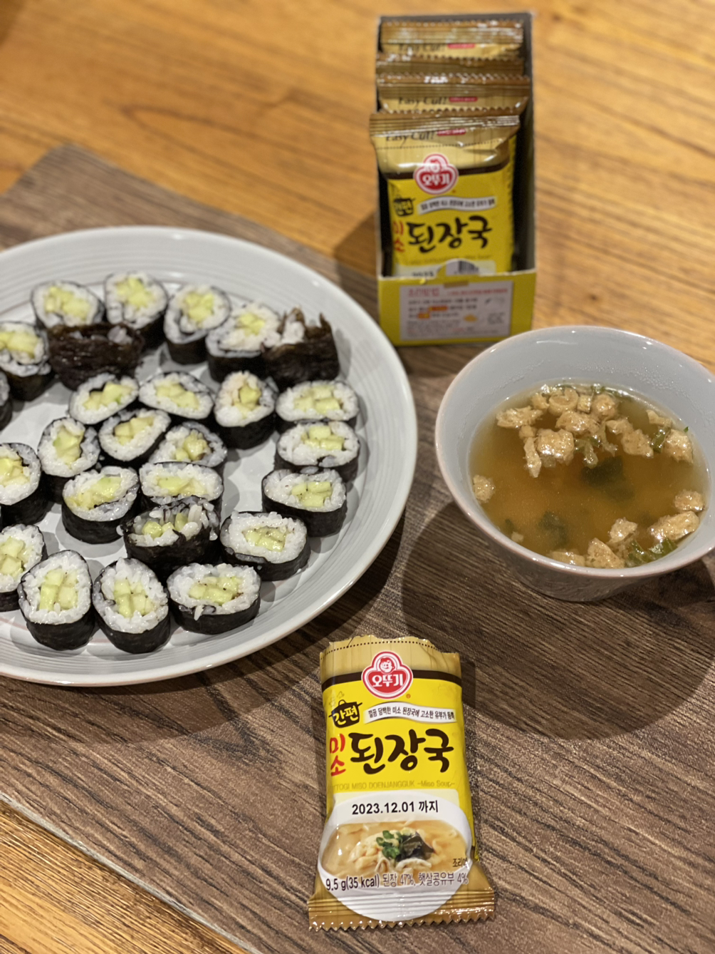 일단 햇반을 돌렸다. 미엘이 작년 6월 다이어트를 시작한 이후로 단 한 번도 밥솥에 밥을 한 적이 없어서 밥솥이 아예 아일랜드 밑에 내려가있어서 밥이 필요하면 요즘은 햇반을 먹는다. 게다가 회를 시키고 받은 초밥양념이 햇반 1개 기준이었기 때문에 오히려 햇반이 좋아아! 돌린 햇반에 초밥 양념을 뿌리고 일단 좀 식히는 동안 김밥용 김을 뜯고(근데 세상에 유통기한이 2020년까지!), 오이를 씻어서 껍질을 벗기고 길이로 썰어뒀다. 오이에는 양념을 하지 않을 계획이라(시간도 없고) 간이 모자랄까 봐 집에 남는 단무지와 피클을 넣으려고 다져놨는데 밥을 먹어봤더니 간이 충분할 것 같았다. 밥이 덜 식었지만 (내 마음이) 바쁘니까 그냥 김밥을 말기로 한다. 김을 깔고, 밥을 얇게 펴고, 오이를 올린다. 이대로 쌀까 하다가 뭔가 심심한 기분이 들어 실리콘 브러시로 간장을 오이에 살짝 바르고 와사비를 얹고 후추를 뿌렸다. 이제 좀 그럴싸해졌다. (돌돌) 엄청 얇은 김밥이 한 줄 완성되었다. 그렇게 세 줄을 쌌다. 미엘은 별로 안 좋아할 것 같지만 나는 마음에 든다. 곁들일 국을 하나 준비하면 저녁 준비 끝!