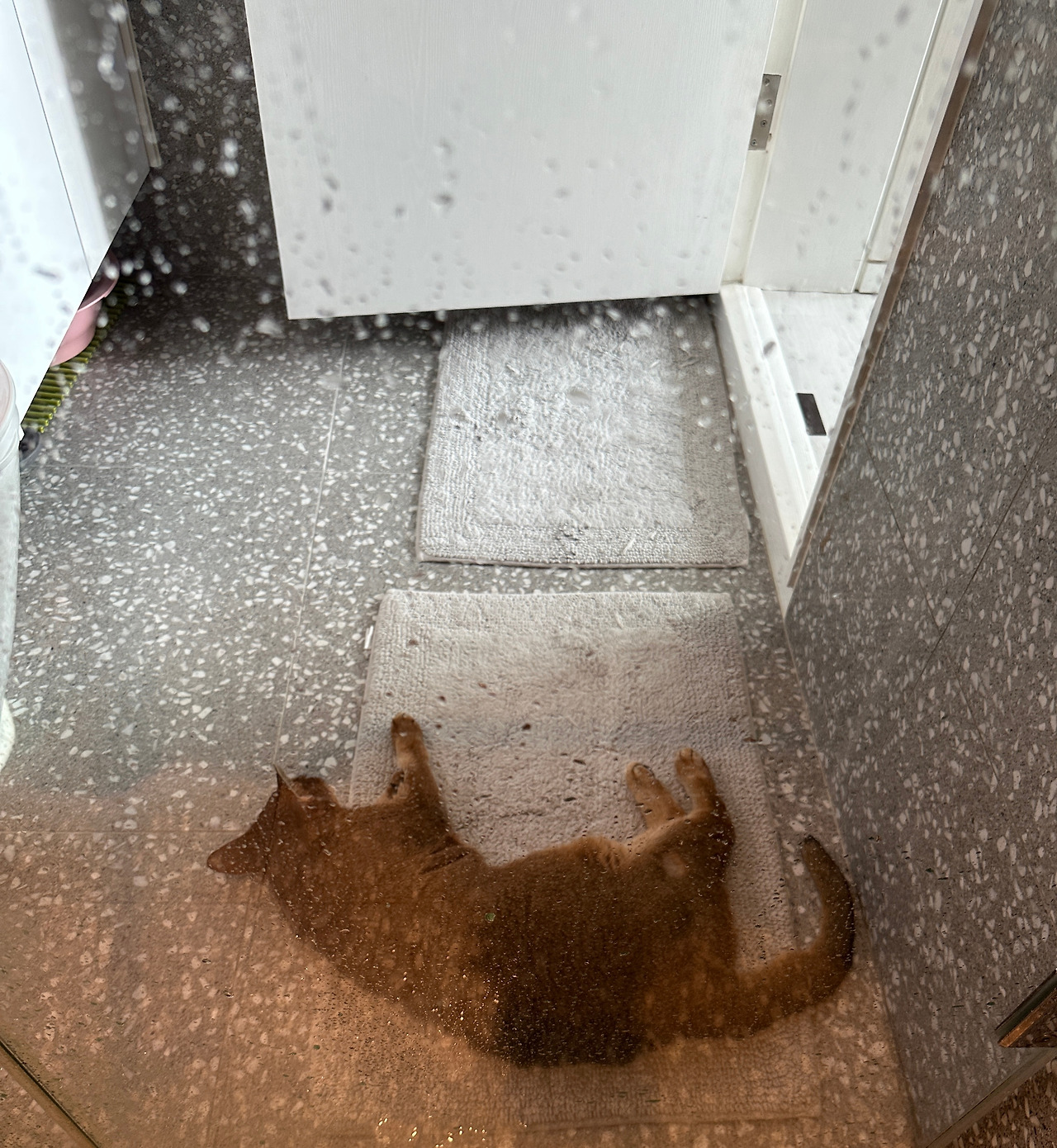 화장실 문은 열고 샤워 부스의 문은 닫는 중에 비척거리며 걸어오는 소리가 들렸다. (tmi. 요즘 마리는 뒷다리가 불편하기 때문에 발이 바닥에 끌리는 소리가 난다.) 한 번에 대여섯 발자국도 쉽지 않아 하면서, 박스에서 화장실까지 한 걸음에 달려온 눈치다. 화장실에 도착하자마자 날 보더니 샤워부스 문 앞에 털썩 쓰러진다.